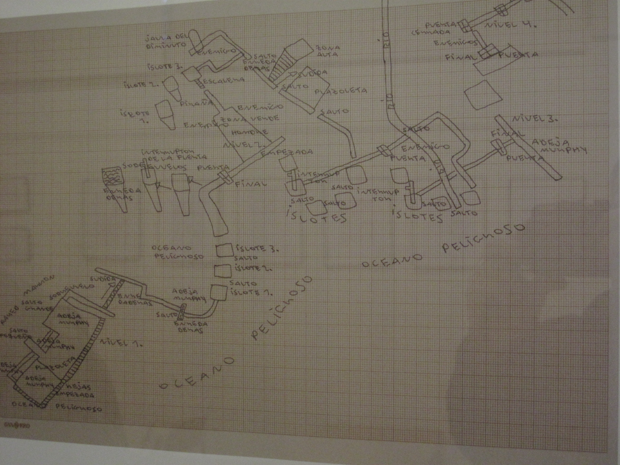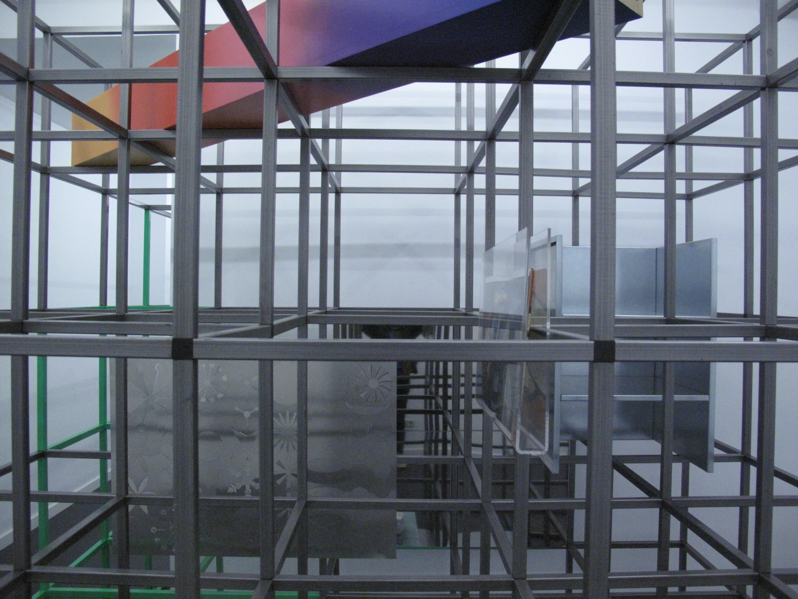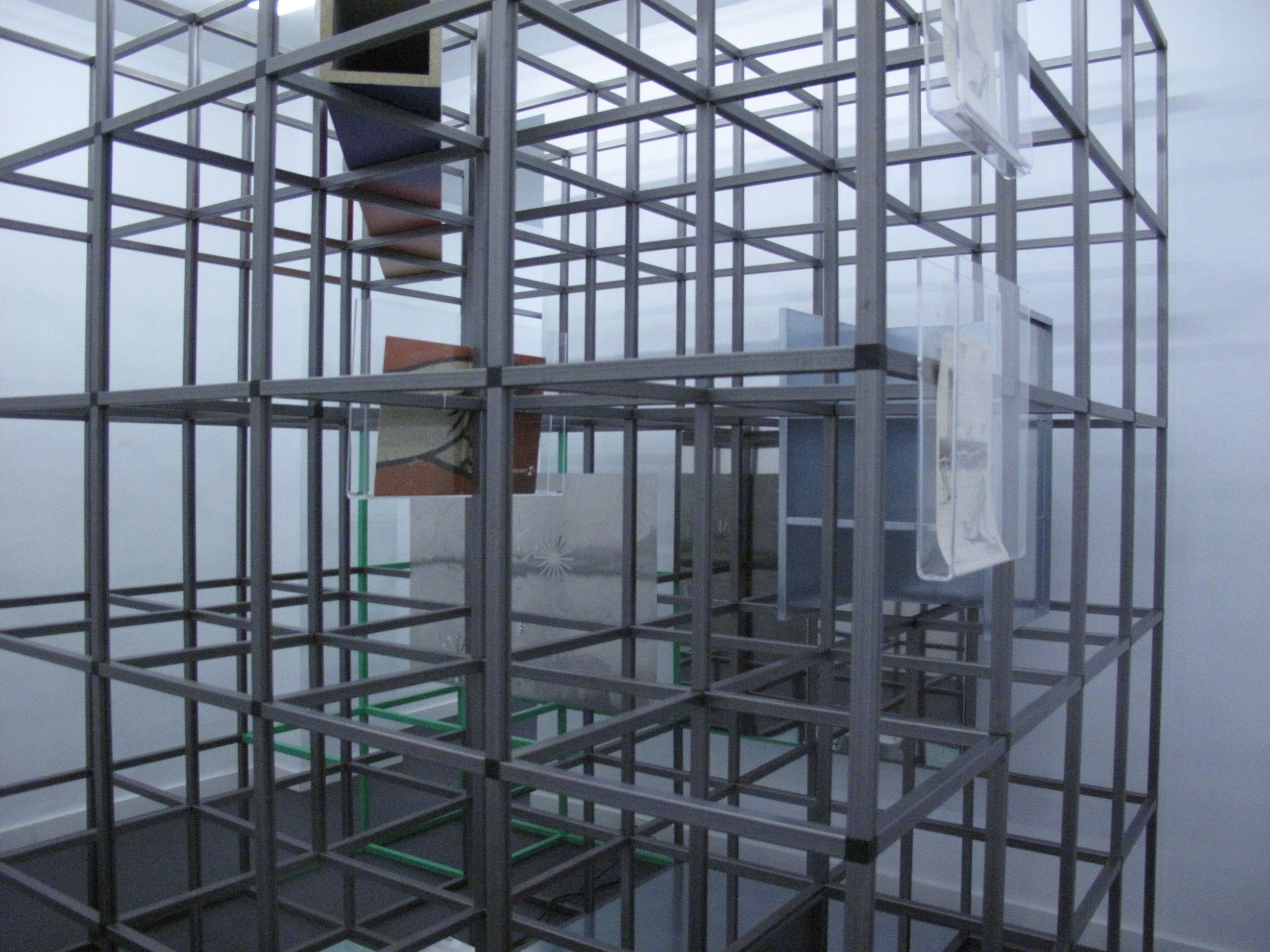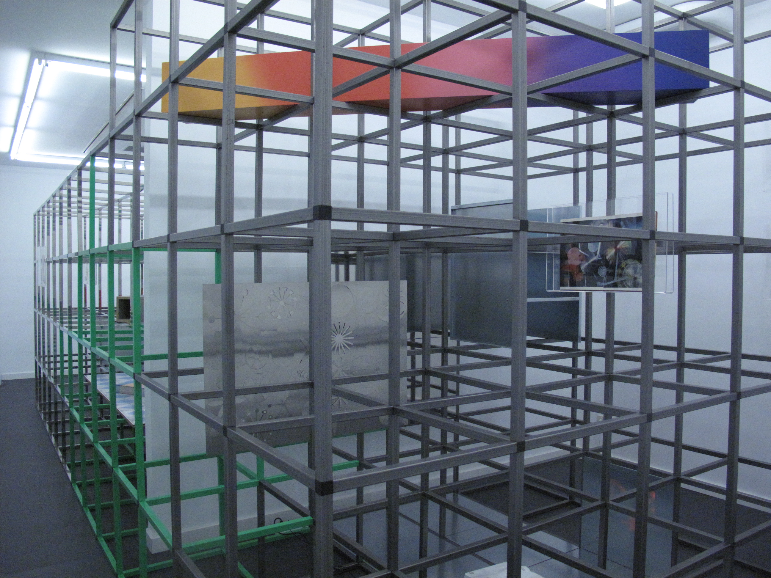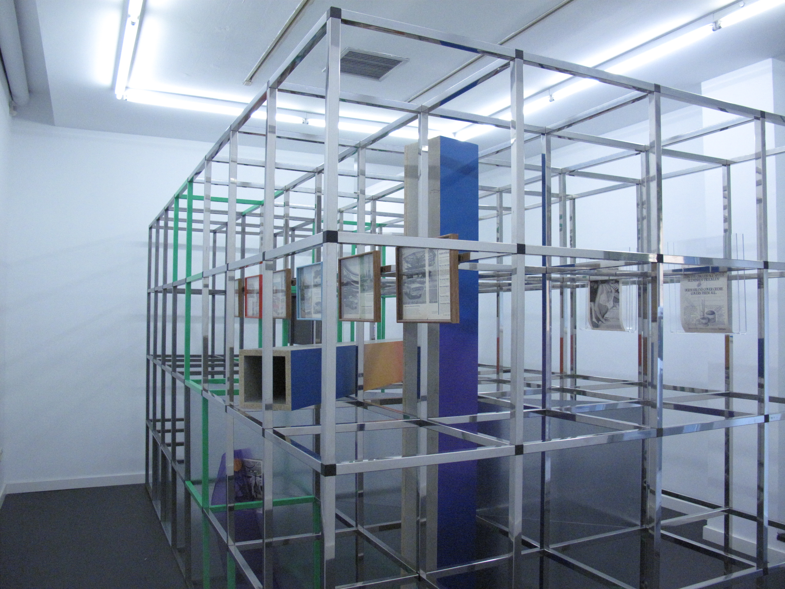 La participación de Mutiloa en esta exposición consistía en una estructura modular construida a base de barras de metal cromadas y coloreadas articuladas creando una trama en cuyo interior se disponían lo que propiamente eran sus obras. De modo que, al tiempo que nos informaba sobre algunas de las líneas de investigación que llevaba a cabo, también nos estaba diciendo cómo lo debíamos ver, digerir, consumir. Debo confesar que la extrañeza de aquel ente de metal adaptándose al espacio, no facilitó mi acceso al discurso de la obra en sí. Me parecía tan raro, distinto, indescriptible y a la vez tan sumamente magnético, atrayente, valiente e intrigante que creí que lo que había en su interior si no estuviera allí tampoco pasaría nada. En realidad poco o nada me aportaba a lo que verdaderamente me había cegado.