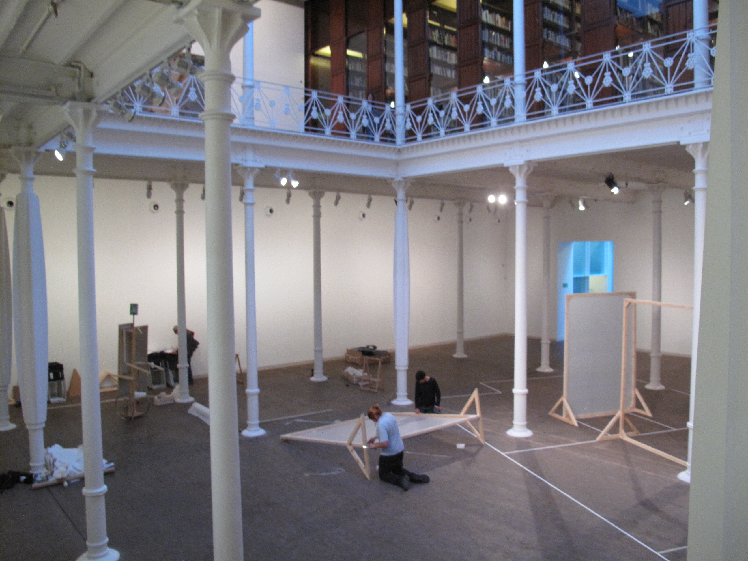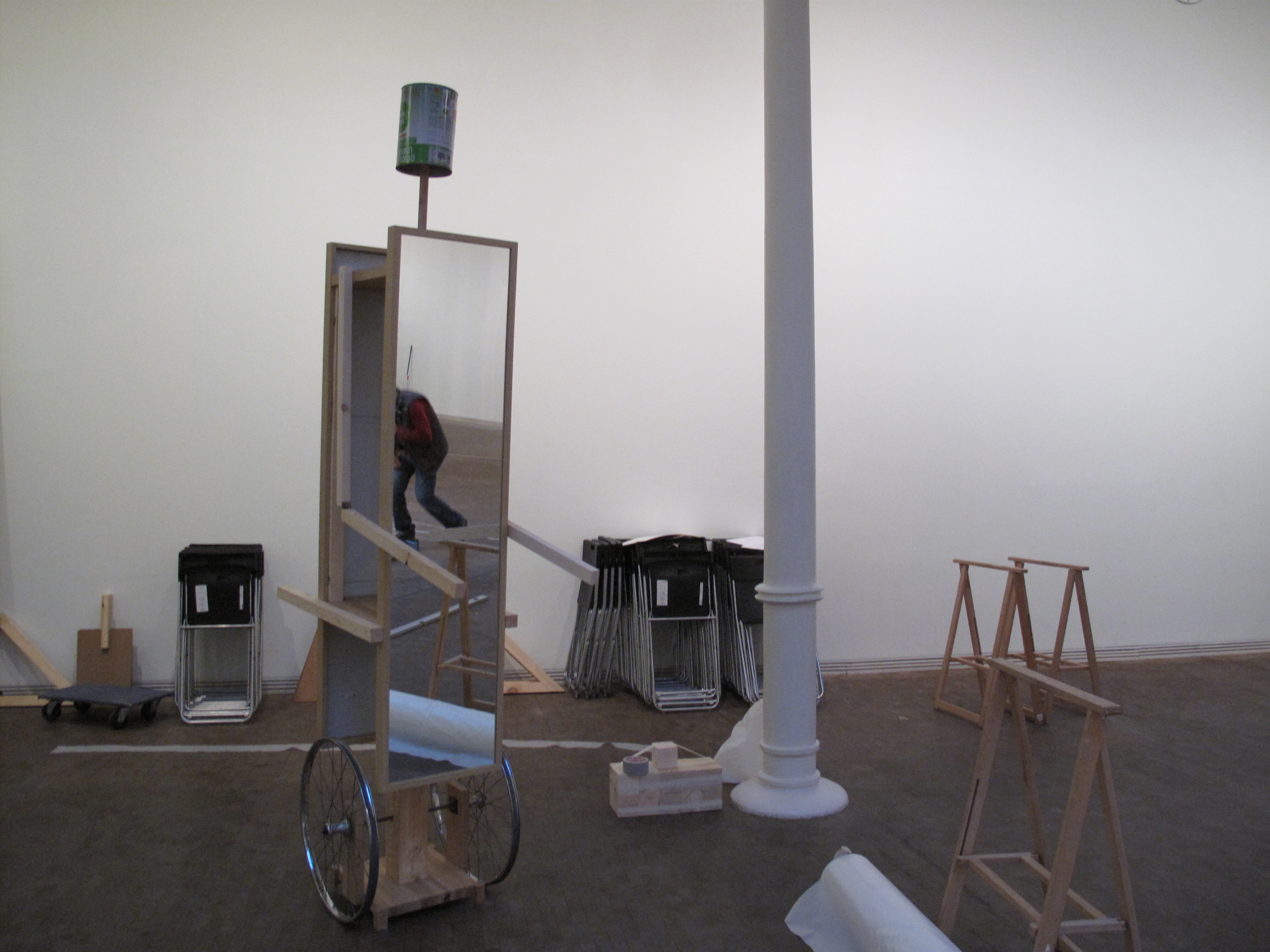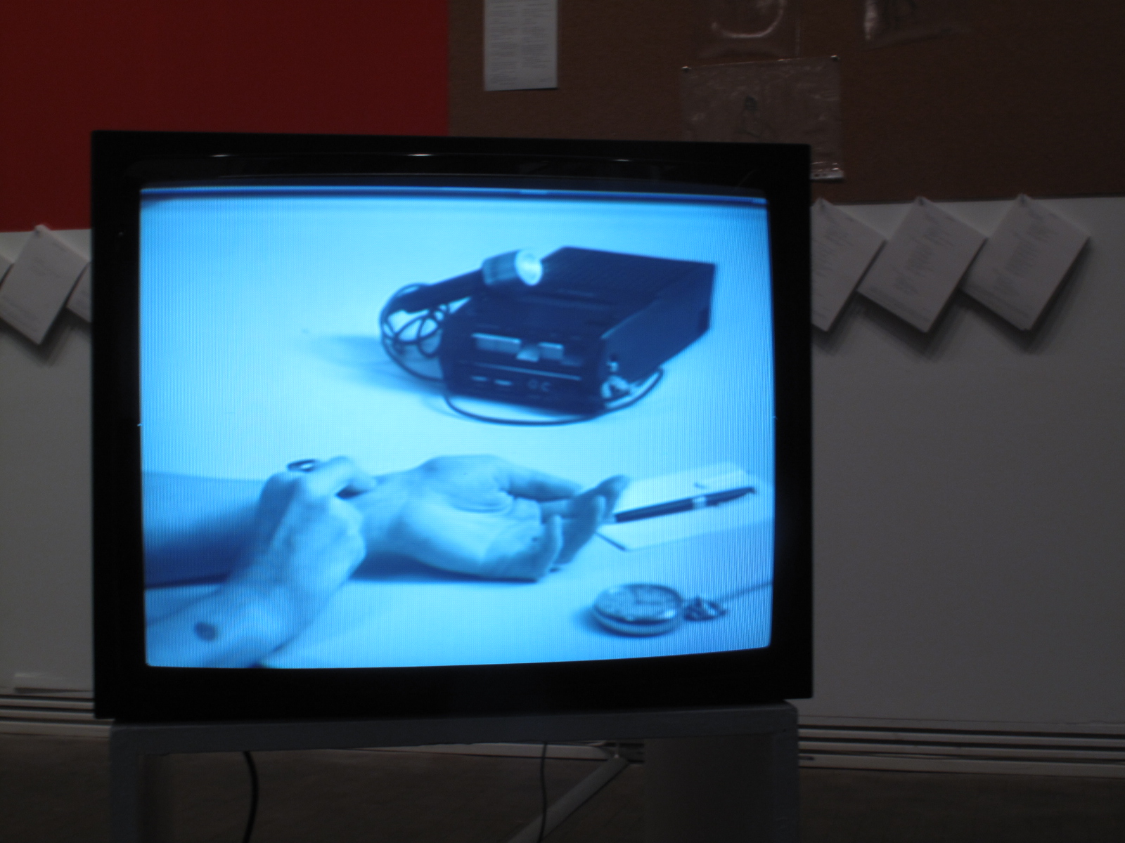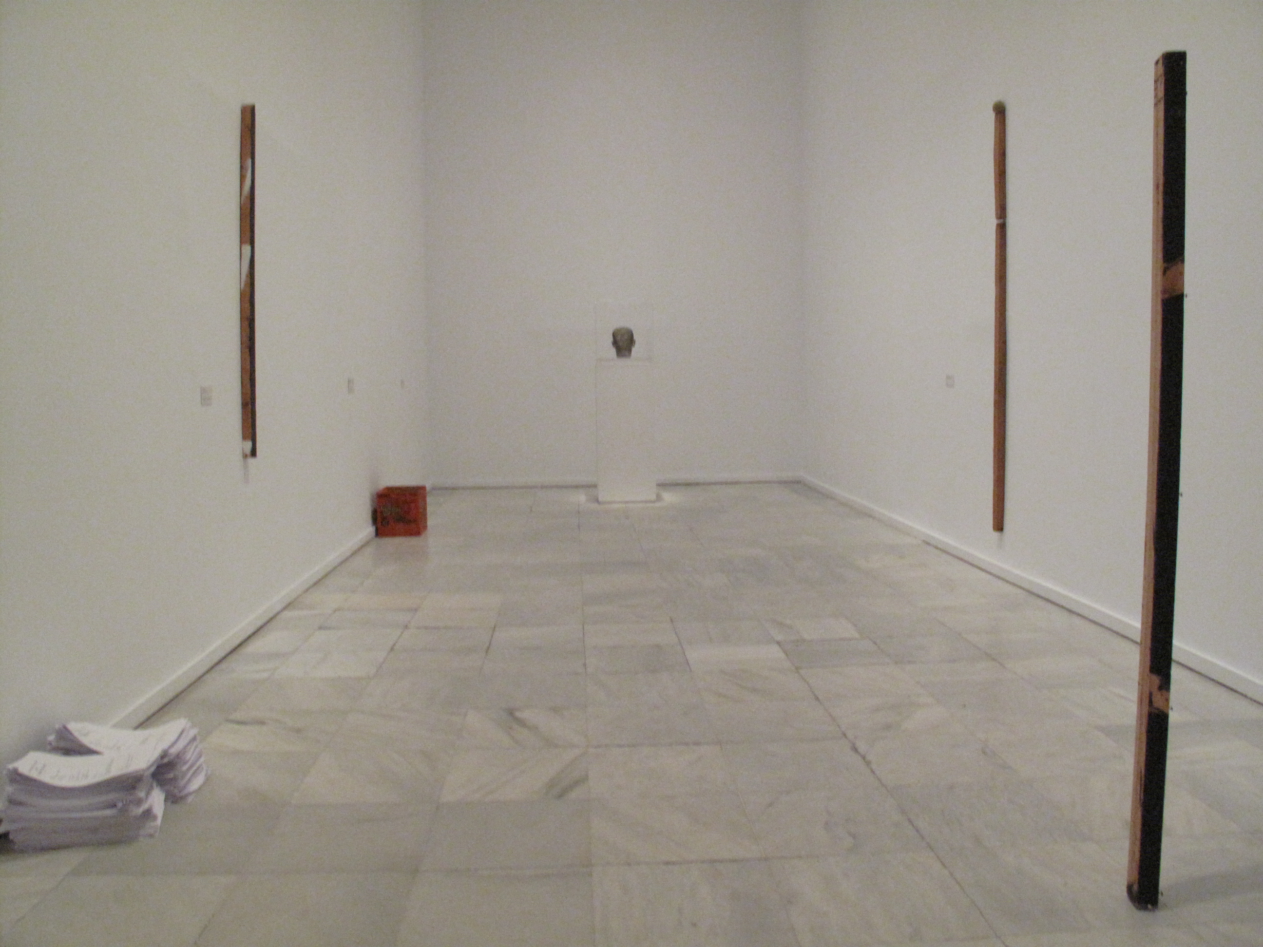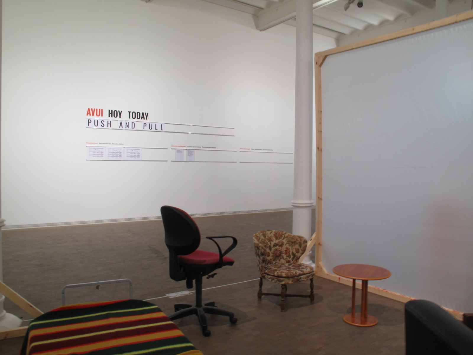 Sea como fuere, la cuestión es que, en una de mis visitas a la biblioteca de la Tàpies de la que siempre-suelo-salir-con- subidón, vi que Laurence y Soledad estaban sentadas en un banco. Y que mientras ellas departían en lo que se me antojaba una conversación amigable, en la sala de exposición donde estaban -a saber: la central, la grande, la más chula, la de las columnas- trabajaban los carpinteros, se presentaban vinilos en la pared, se montaban unas mesas, instalaban corchos en la pared para colgar cosas, llegaba un sofá, llegaban archivadores y estaban en marcha dos monitores a través de los cuales se veían imágenes de los happenings de Kaprow y diverso material documental. Después de saludarlas, les pregunté qué hacían allí y me dijeron que estaban en la exposición. «¿Qué exposición?», les pregunté. Y me dijeron que en la de Kaprow. Que se había abierto aquel mismo día a la hora habitual de la Fundació -es decir, a las 10:00 am- y que, a partir de aquel momento, la exposición se empezaba a hacer. O sea, que no había habido ninguna inauguración, que tampoco se la esperaba, que la apertura no se había publicitado de ningún modo y que lo que estaba viendo con mis propios ojos era lo que tendría que empezar a asumir si quería entender de qué iba todo aquello.
