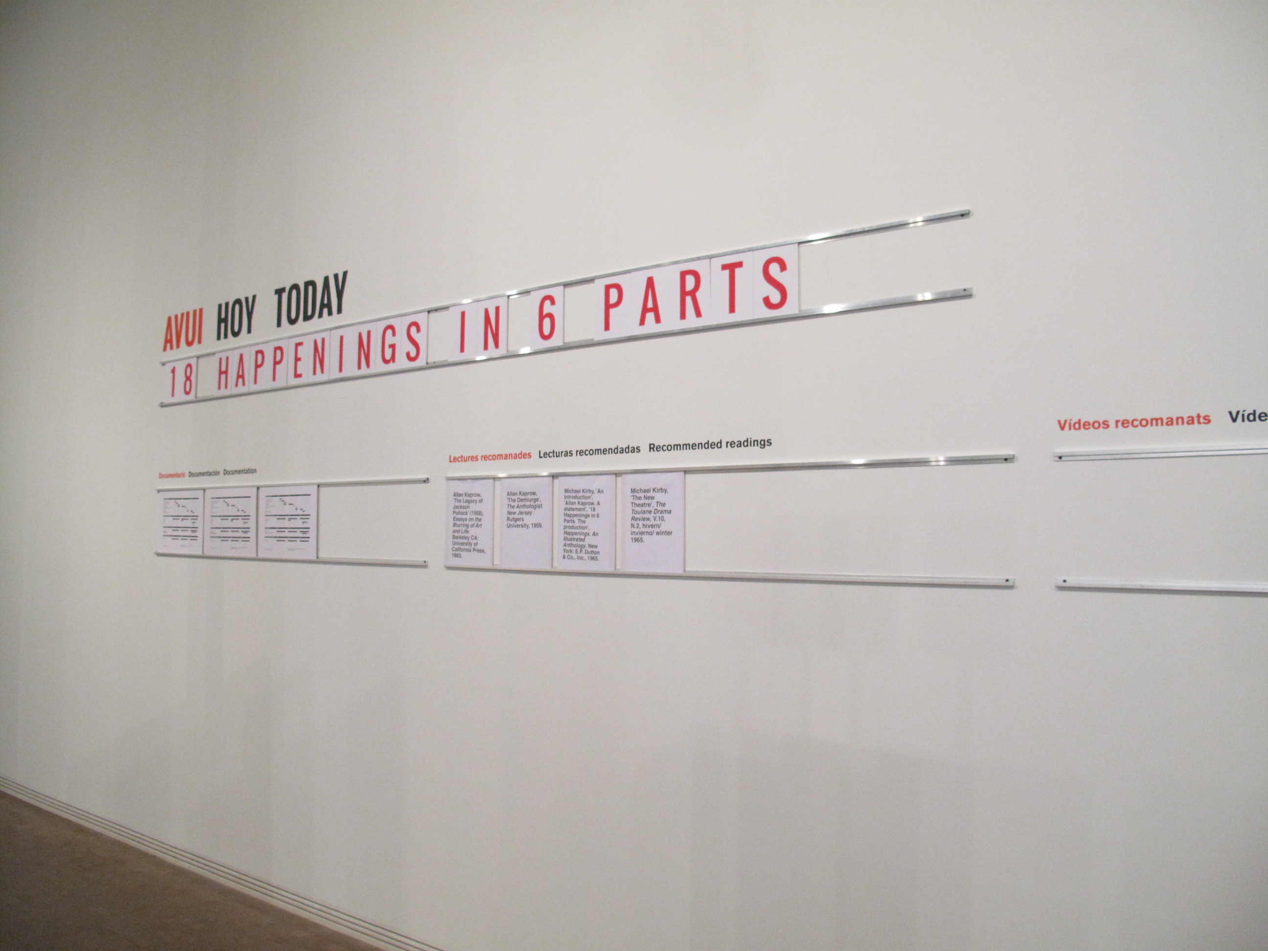 Una vez entendido que para captar la esencia de esta exposición tenía que romper con la idea de tiempo-para-consumir-exposiciones y expandirla hacia algo que todavía ignoro, me he propuesto frecuentar cuantas más veces posibles la sede del proyecto -o sea, la Fundació Tàpies- y participar activamente en los happenings que se programen. Pensados para que se sucedan durante el tiempo que dura la exposición, los once happenings que se han escogido está previsto que se lleven a cabo tanto en la sede de la fundación como en espacios como Bulegoa (Bilbao), el Museo Vospell Malpartida (Cáceres), escuelas públicas de secundaria, la calle, nuestras casas o, simplemente, allí donde se lean las instrucciones. Al fin y cabo leer también es una acto creativo. Asimismo, si algunos de estos happenings serán recreados por artistas, colectivos o cualquiera de nosotros a partir de las instrucciones de Kaprow, lo único que se pide es que sean site specificity -o sea, teniendo en cuenta el contexto y lugar-, que no den pie a la creación de ningún objeto y que, sobre todo, cuestionen el arte y al artista.