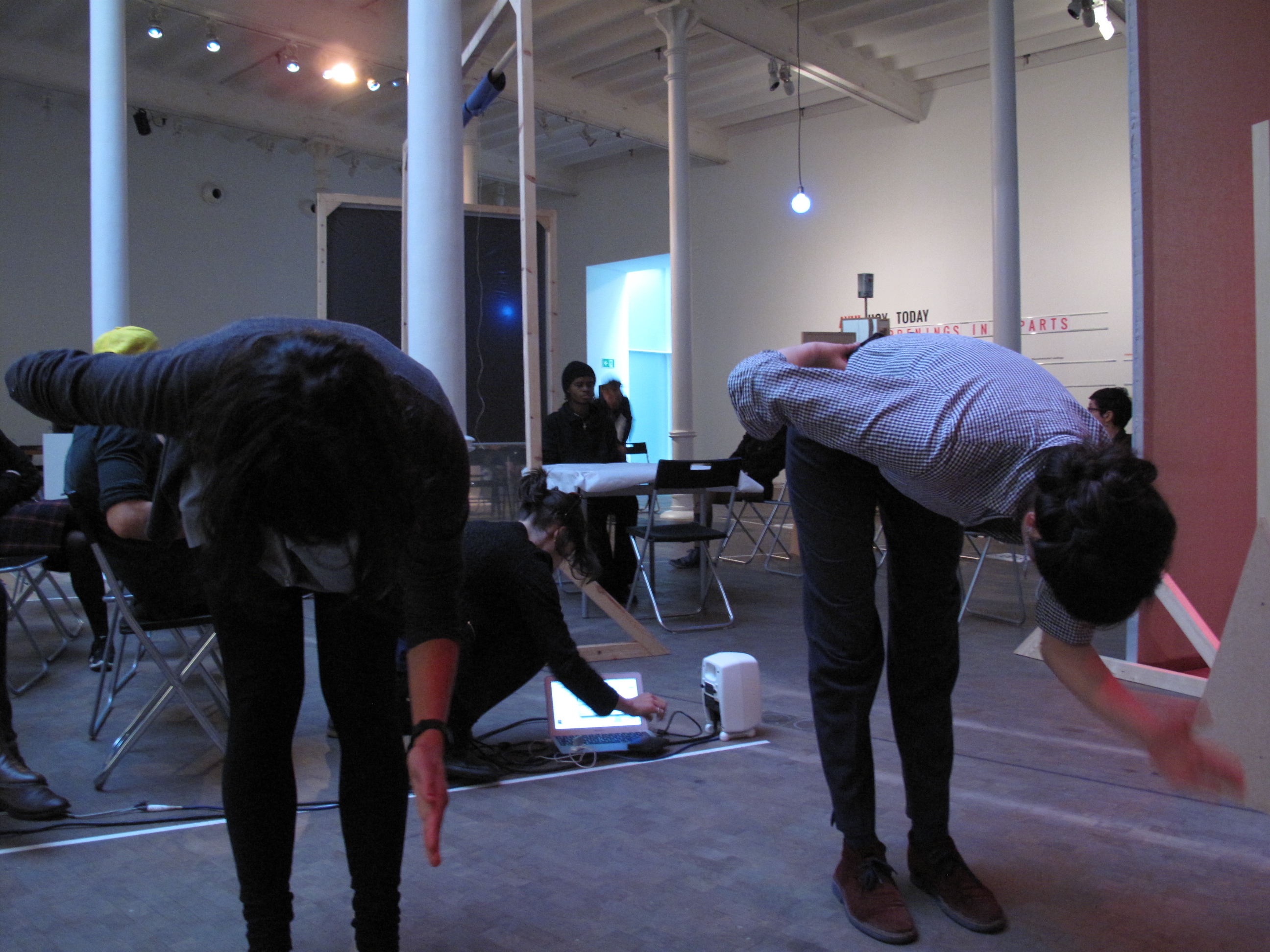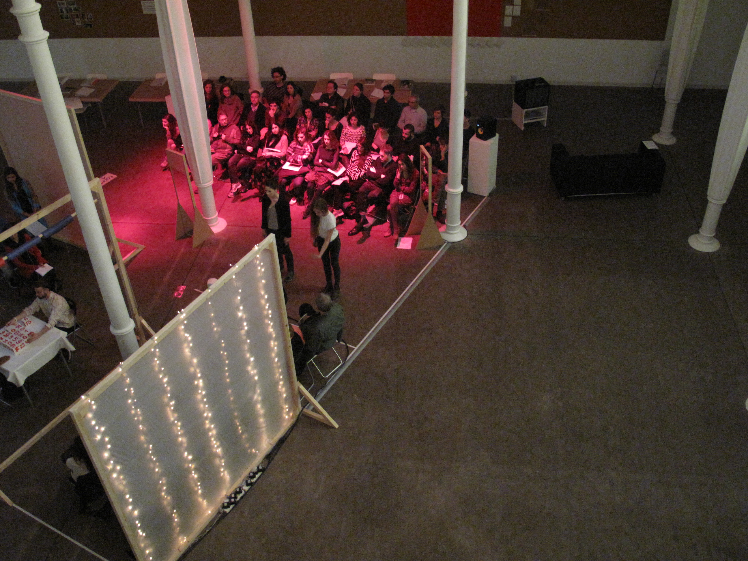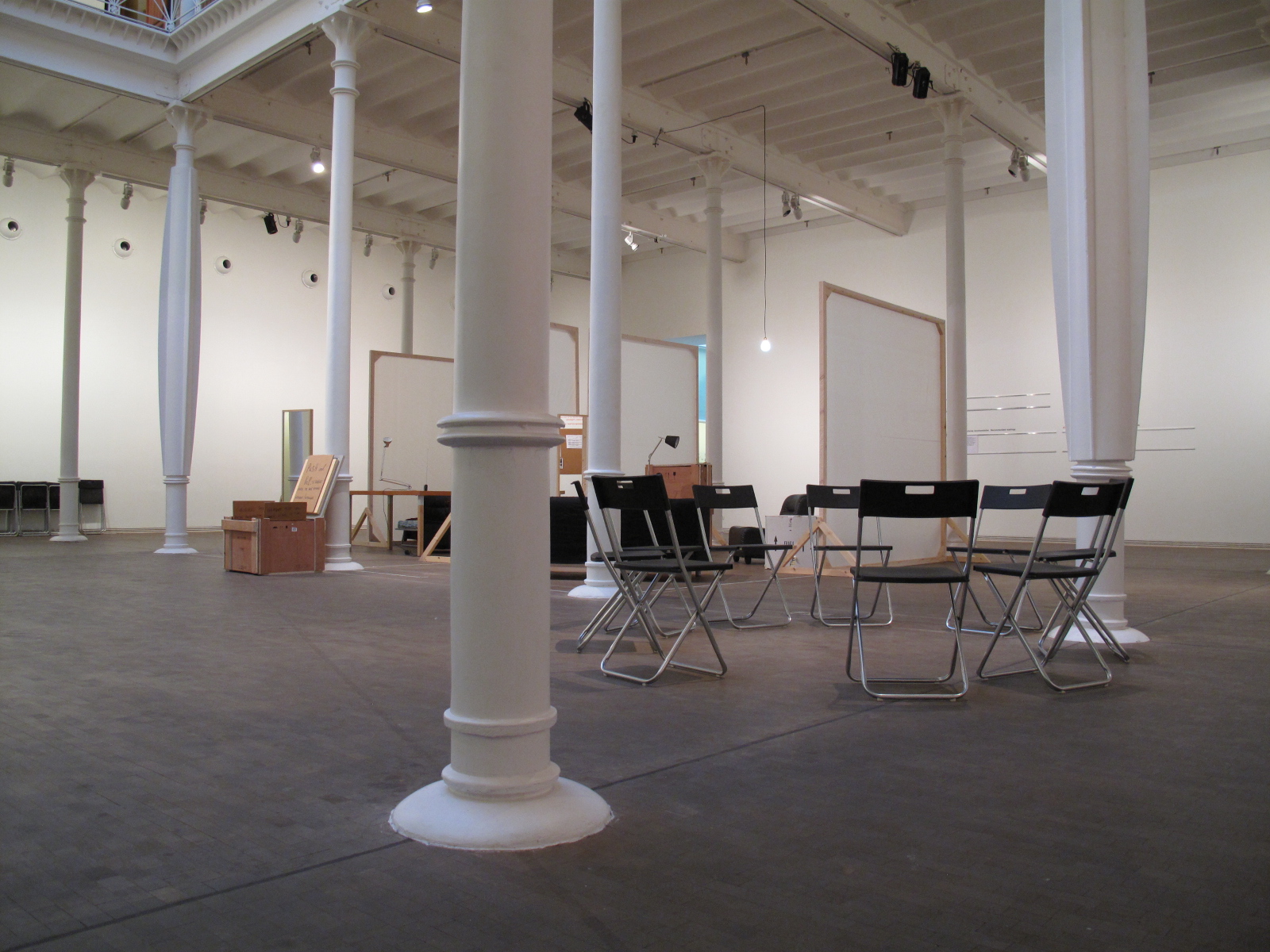 Aunque para no perder demasiado el tiempo empecé a empaparme de esta experiencia-Kaprow el mismo día que en estuve hablando con Rassel y Gutiérrez, no fue hasta que llegaron los alumnos de Dora García en la escuela HEAD de Ginebra, cuando vi que la cosa tomaba cuerpo y que, por fin, vería algo. Debo confesar que necesitaba este algo para acabar de decidirme. Durante los días previos a la realización de 18 happenings in 6 parts, 1959 -el primero de los happenings programados y que, a modo de bisagra, sirve para cerrar la etapa más «formal» de Kaprow e introducirnos en la más conceptual- vi cómo los alumnos de Dora evolucionaban en sus ensayos, que los técnicos seguían cuidando el aspecto visual de la sala, que los carpinteros levantaban los muros donde se iba realizar el happening, que cada vez que entraba un visitante alguien iba a su encuentro para decirle que aquello era una propuesta expositiva y no que todos se habían vuelto locos y que este caos semi ordenado tenía su qué y yo la fortuna de vivirlo.