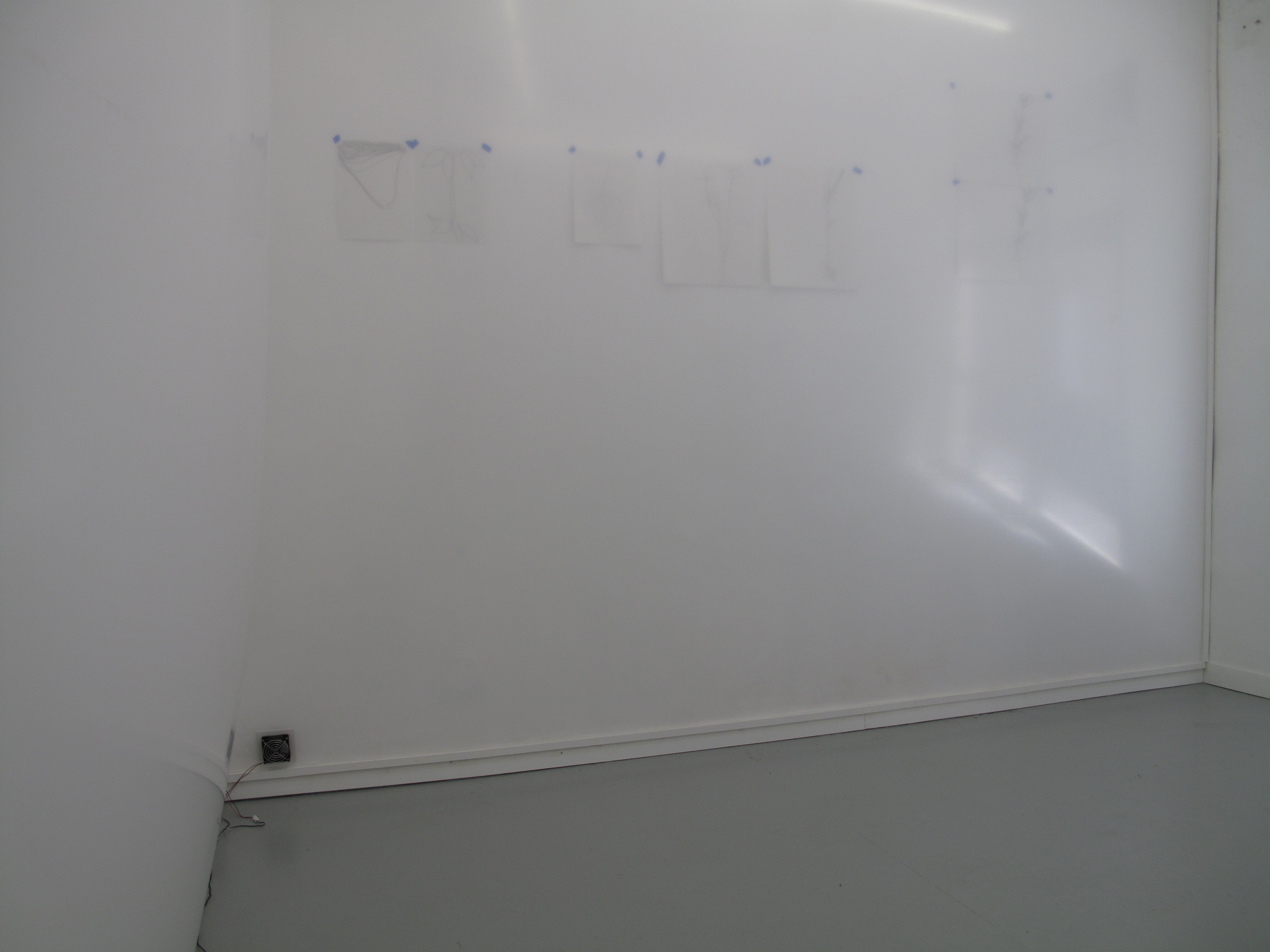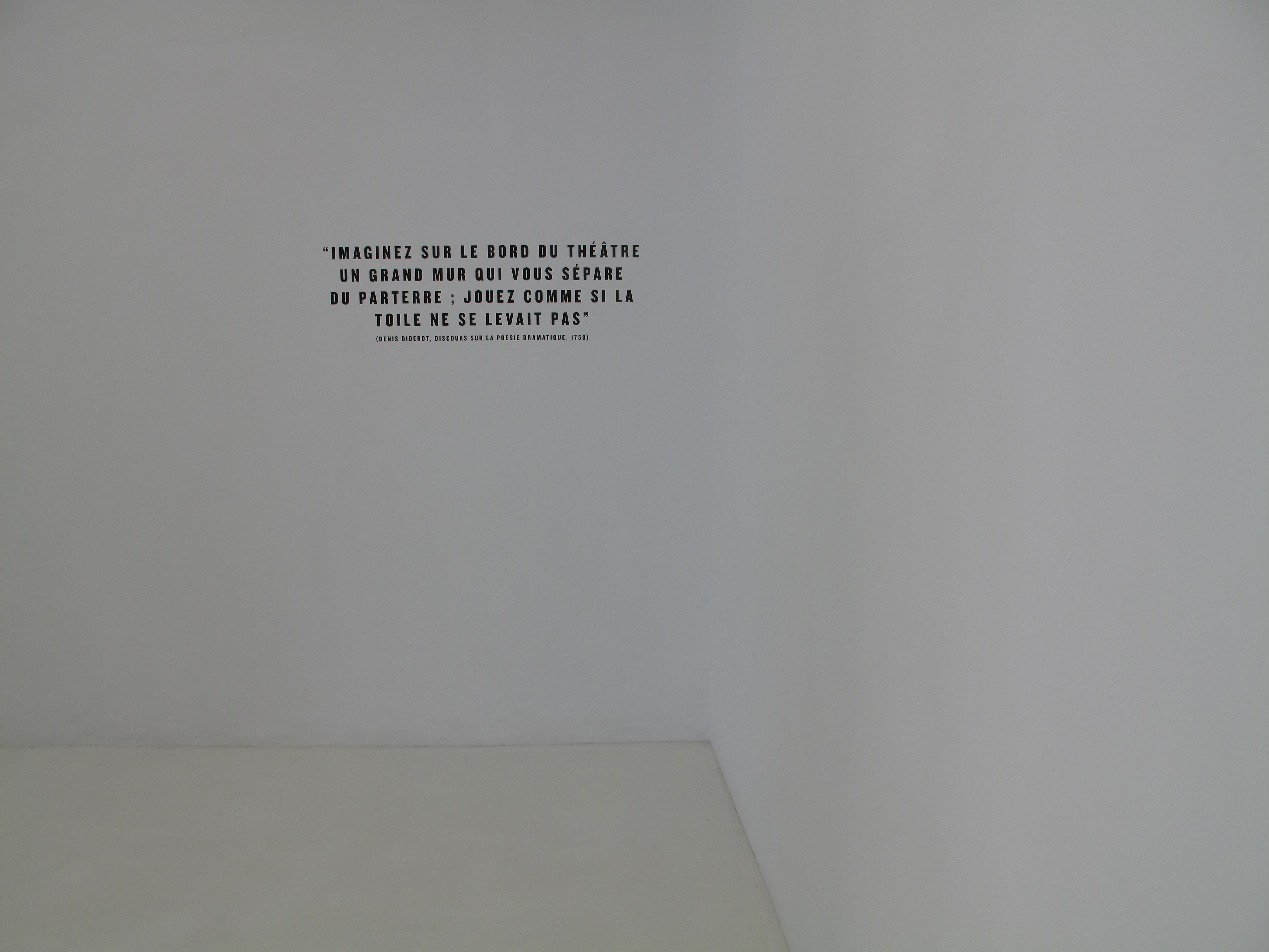 A diferencia de la exposición de Lois Patiño en la New Gallery en la que, complicándose la vida hasta decir basta, el artista tira de un hilo demasiado fino para decir lo que, con menos de la mitad de lo que muestra, hubiera sido más que suficiente para seguir pensando que es un gran artista, Pol González ha optado por la honestidad, la contención y la transformación de la galería en una suerte de cine en miniatura. Teniendo en cuenta que lo que se debía ver no era otra cosa que su película, transforma la primera sala de la galería en un espacio blanco y, lo que era la oficina, en algo parecido a una sala de proyección. La razón: colocar en la primera sala un cartel de la película y una cita de Diderot grabada en vinilo sobre la pared -«Imaginez sur le bord du théâtre un grand mur qui vous sépare du parterre; jouez comme si la toile ne se levait pas»- y, en la sala de dentro, la película y dos sillas.