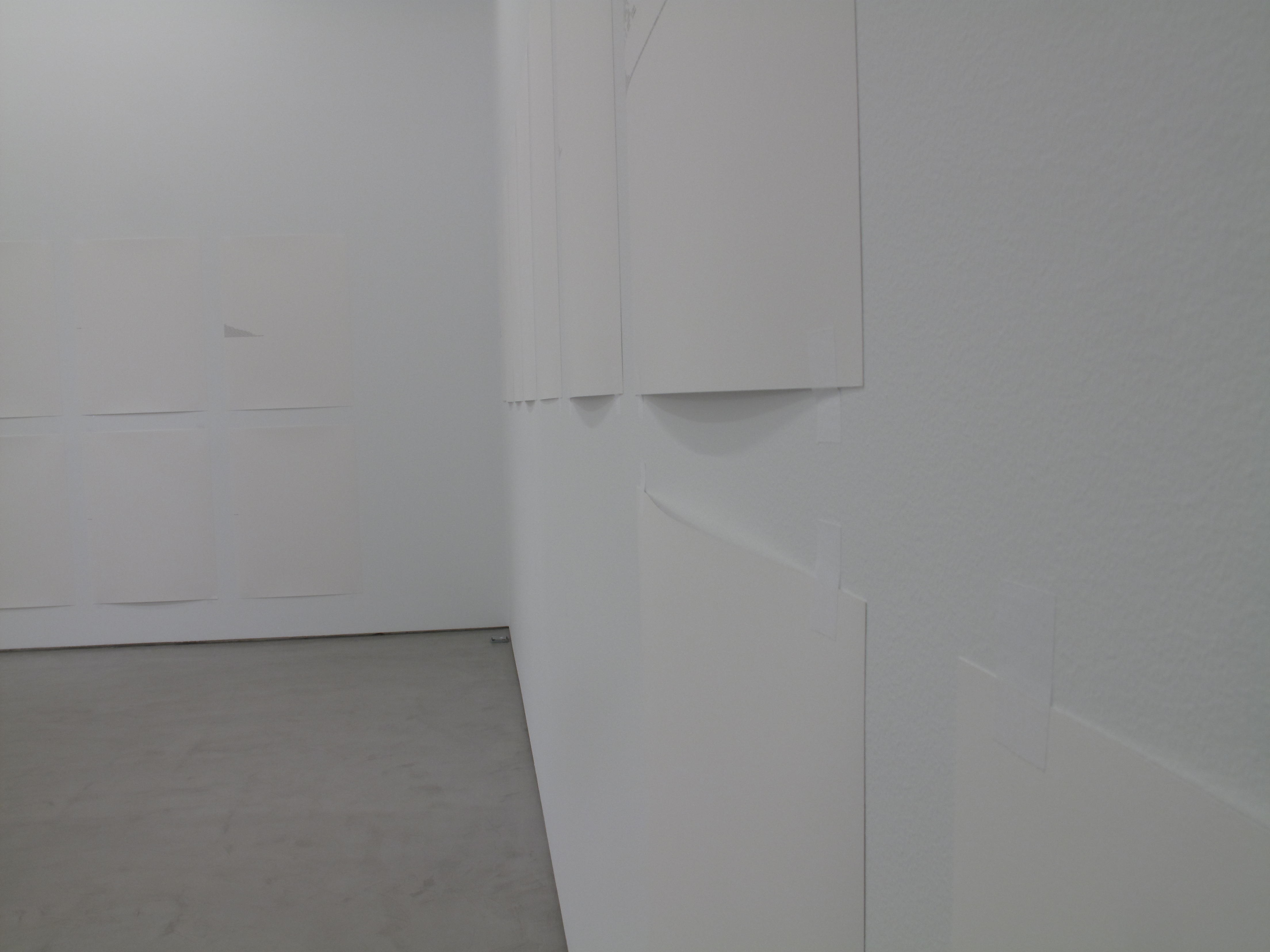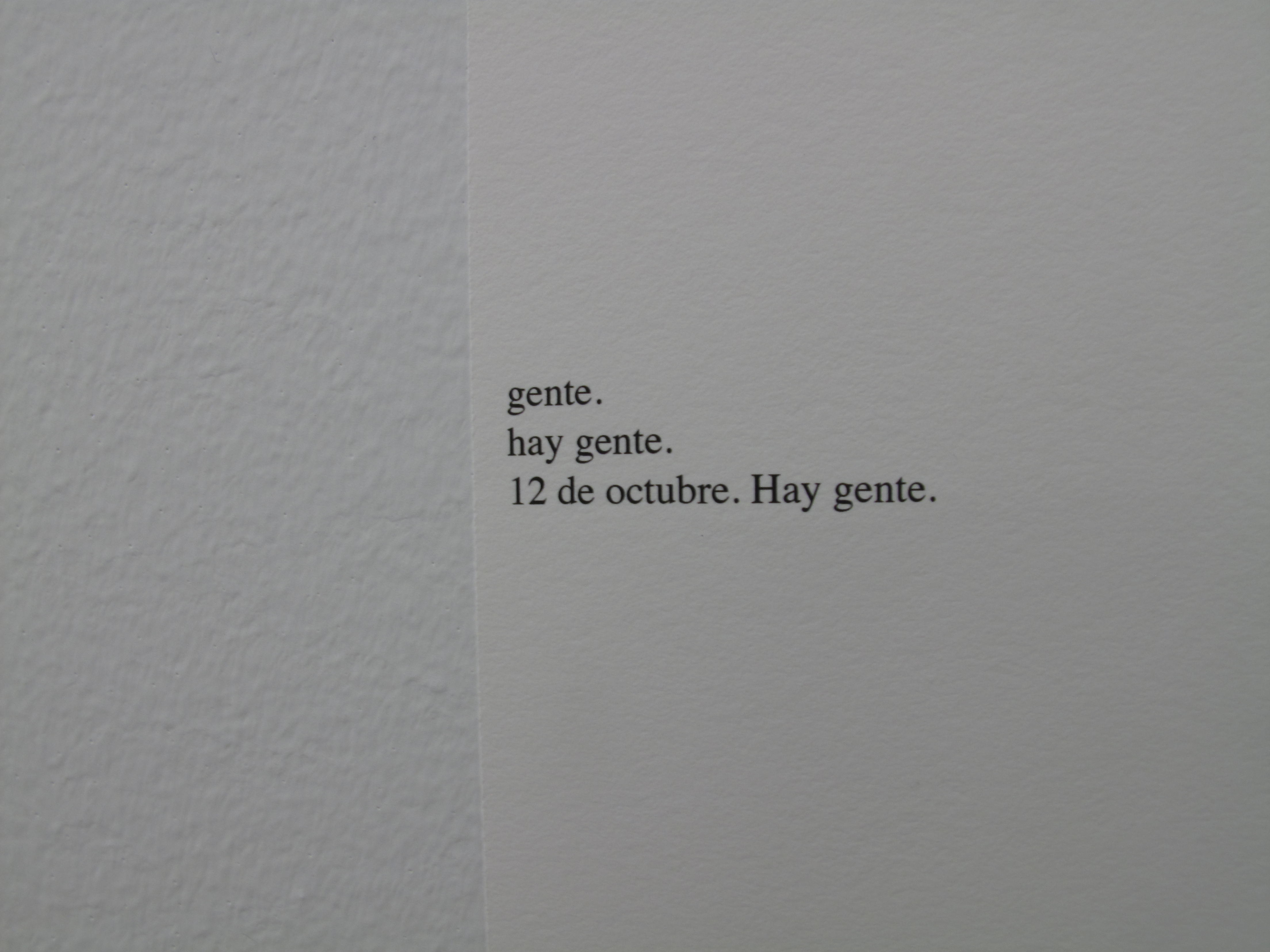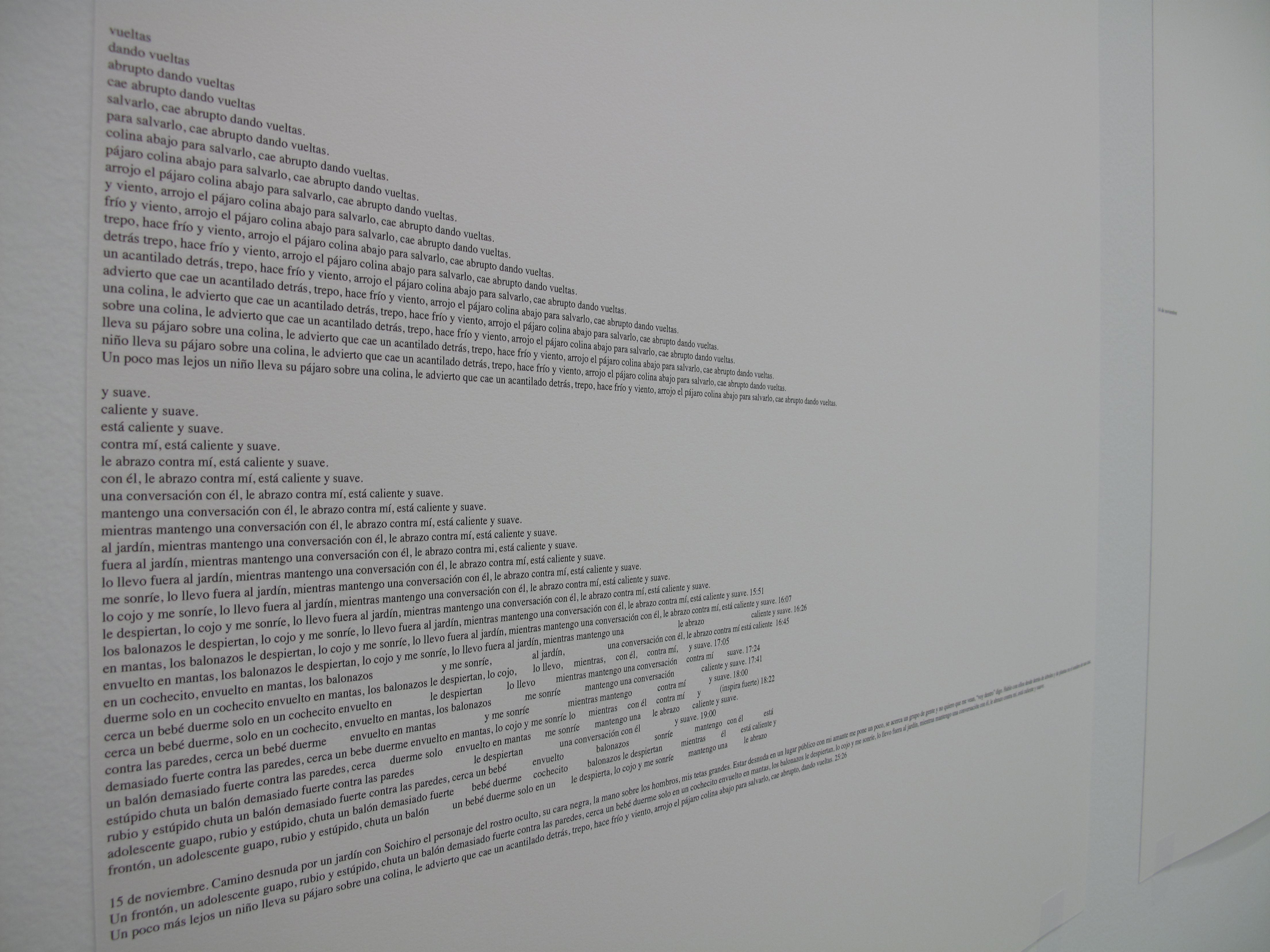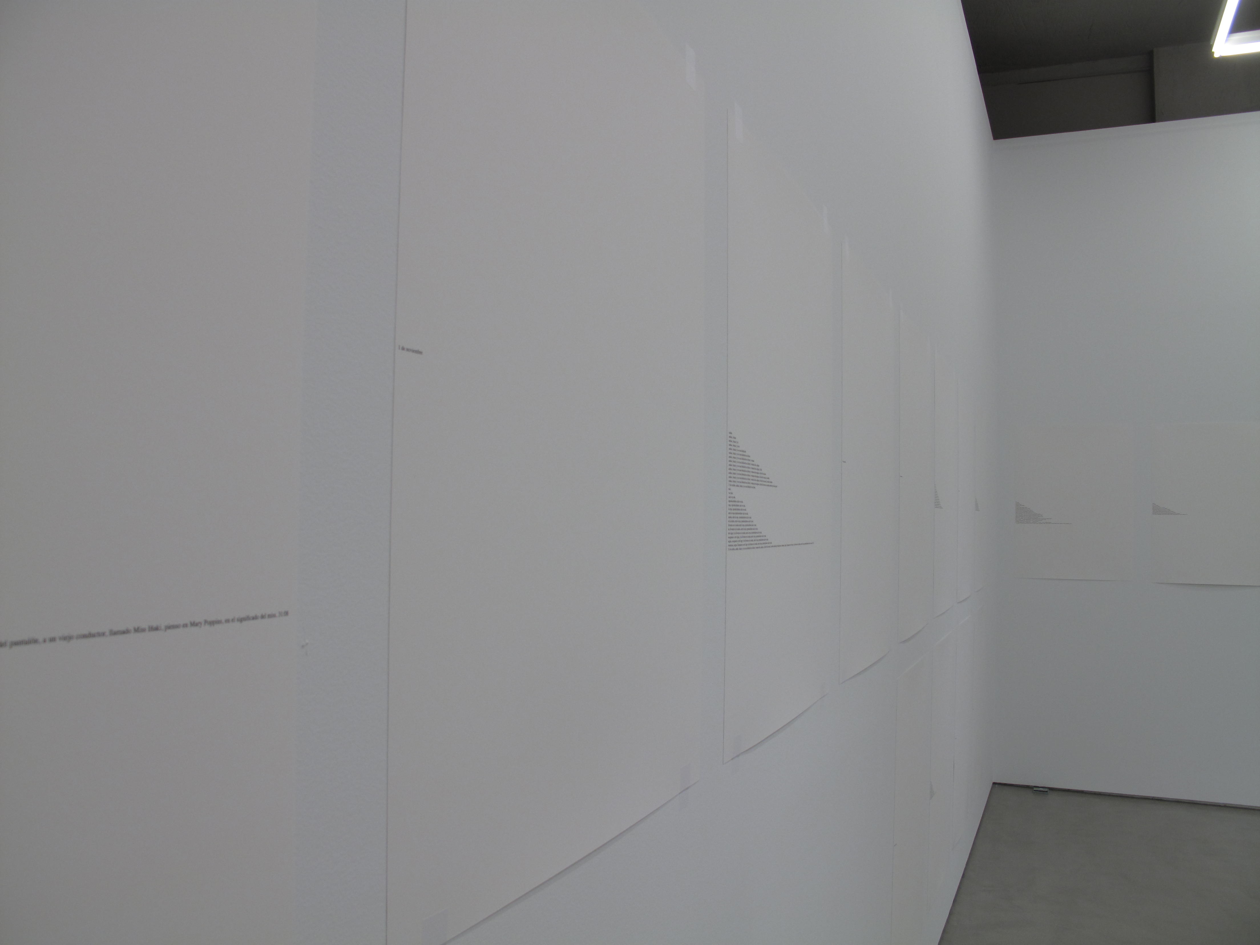 Al entrar en la sala no sabía por dónde empezar. A mi derecha había un video de una performance en la que se veía a la propia Itziar contando del uno al diez tumbada en la arena junto a la orilla del mar. Las paredes de las salas se habían empapelado con grandes hojas de papel y en algunas de ellas sólo aparecía una fecha escrita. En otras, sin embargo, se distinguían distintos textos formando distintos dibujos de distintas extensiones. Como una suerte de partituras todas distintas aunque con algo en común. Quizás el tamaño del papel… Quizás también otra cosa…. Al acercarme a una de ellas vi que se trataba de un texto y que, al igual que aquella performance que había visto en Barcelona, se montaba y desmontaba a través de la aparición y desaparición de palabras. Al establecer entre ellas una asociación inmediata me vi subyugado por lo que se abría ante mis ojos: una performance con el actor ausente, resuelta exclusivamente a través de la palabra escrita, formada por un número concreto de hojas y englobado en el proyecto que, al leer la hoja de sala, vi que se titulaba 51 sueños, entre el dos de octubre y el veintiuno de noviembre de 2014. Es decir, el registro de los sueños que tuvo la artista durante este breve periodo de tiempo.