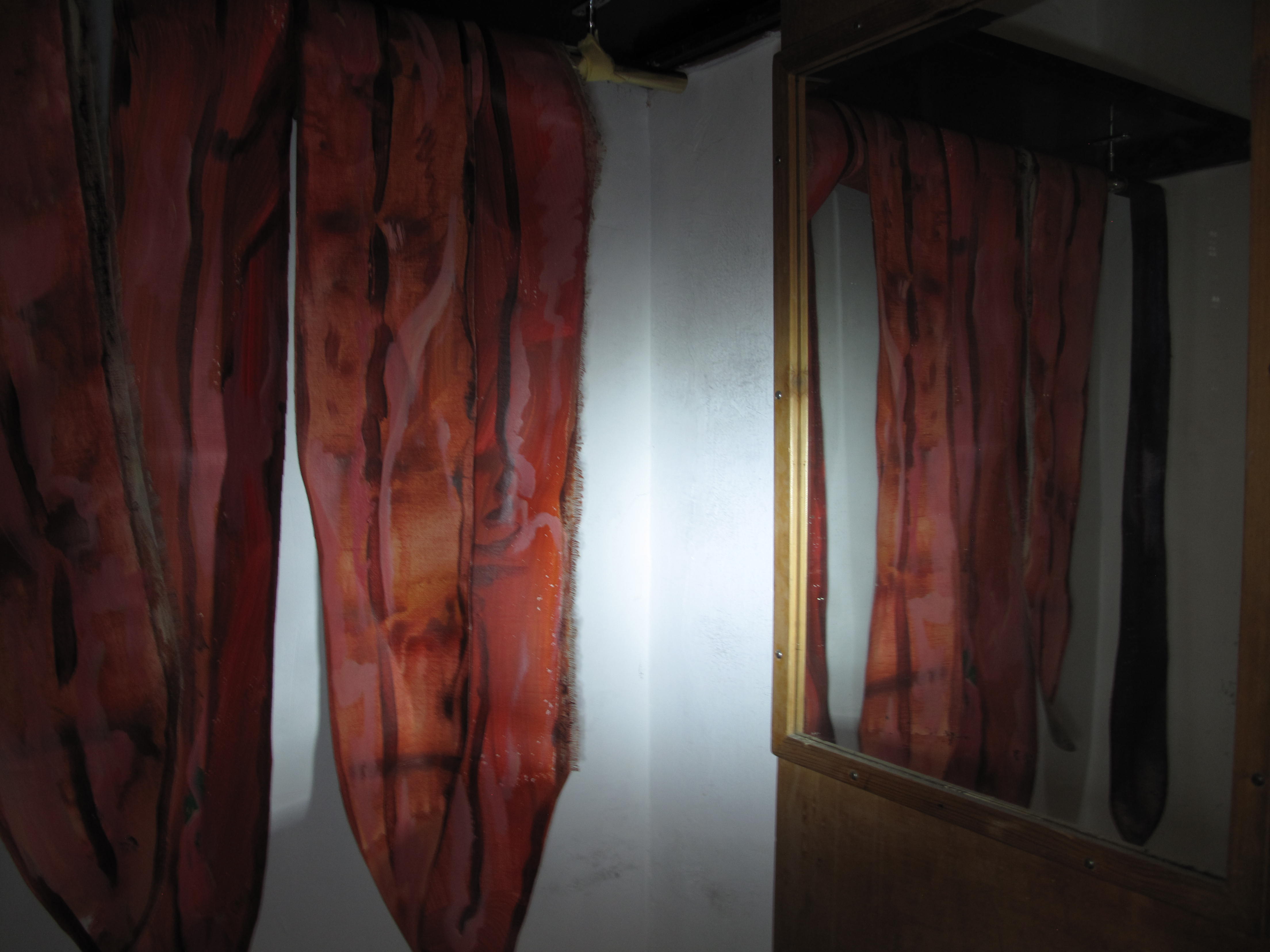 Si las pinturas que vimos de Rasmus y Pere procedían, en su mayoría, de su producción en el taller, buena parte de lo que las complementaba fueron muestras de lo que hicieron para convertir la casa en un lienzo y sus esquinas en espacios susceptibles de explorar. Como deberíamos hacer con cualquier pintura. Entre las sorpresas que nos aguardaban y que, si quisiera enumerar, no sabría cuándo parar, había dos que me cautivaron de manera muy especial: un dibujo de Pere Llobera sobre polvo de una mesa representando al propio artista saltando y corriendo entre la frondosidad de un bosque y el armario de corbatas-lengua con que Rasmus decoro el vestidor. Dos must!
