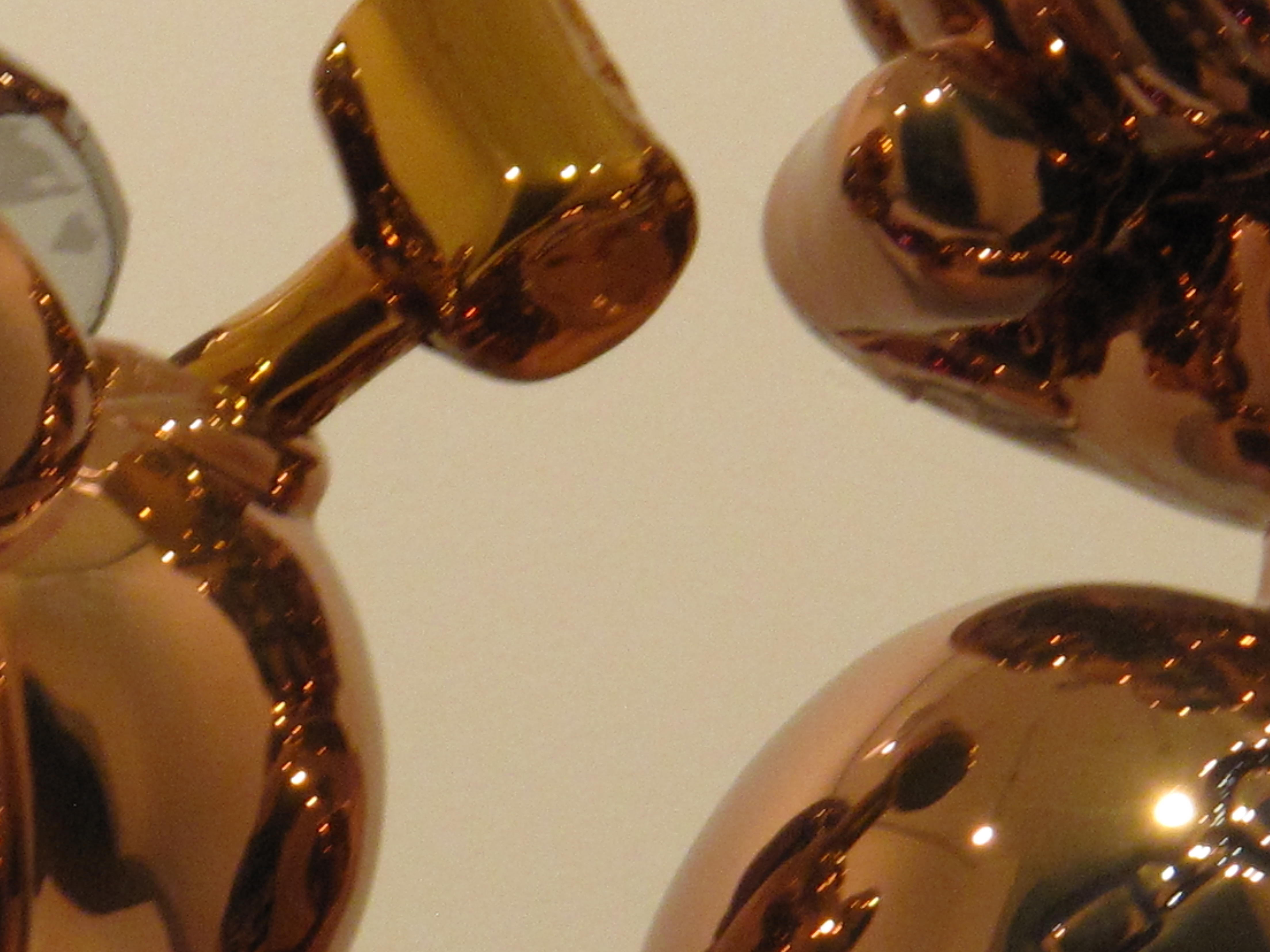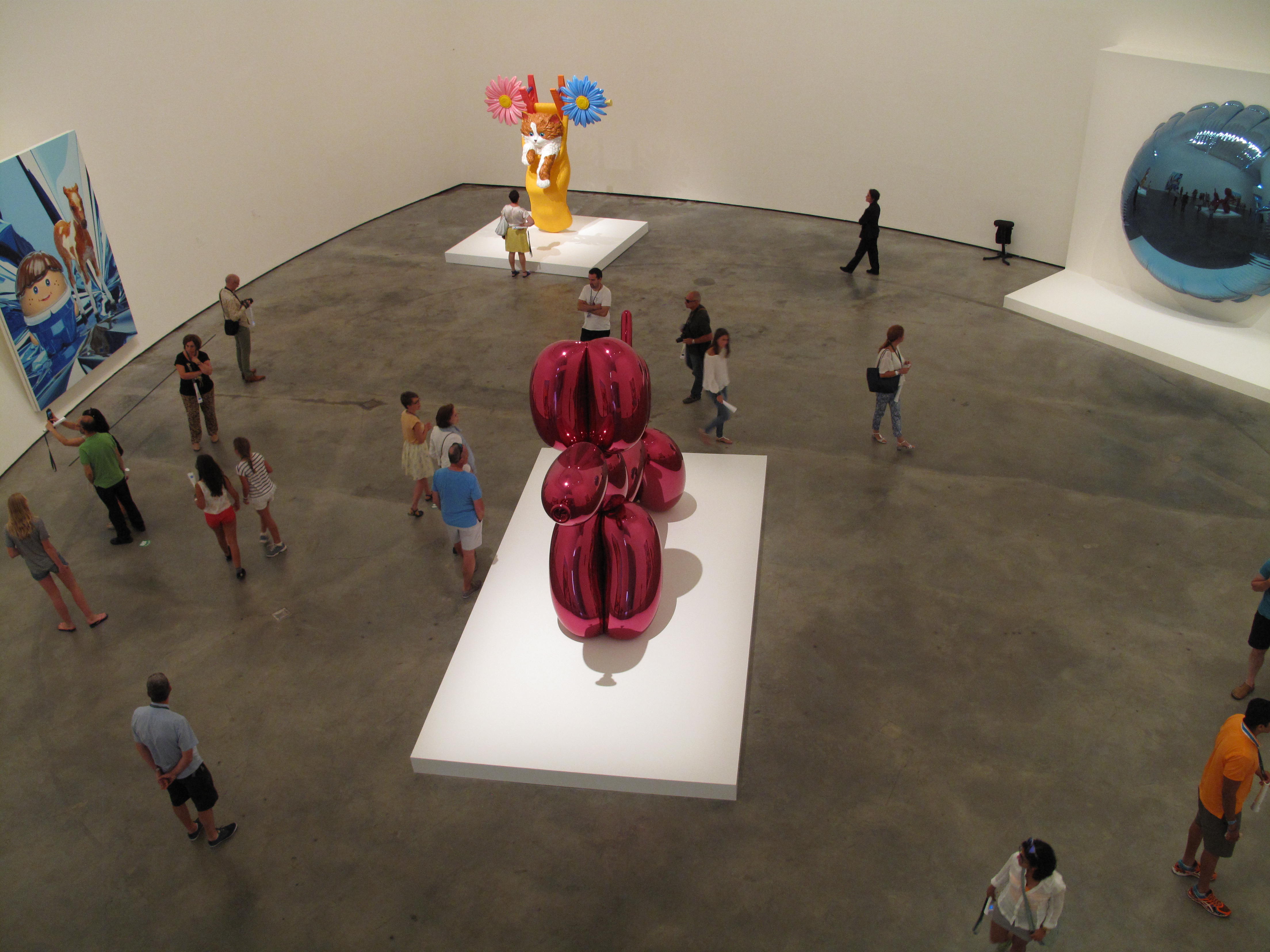 Del primero podría decir que fue un momento especial por cuanto me permitió volver a disfrutar de sus tótems de aspiradoras realizados durante la década de los 80. Preservados en urnas de metacrilato sobre ristras de fluorescentes mostrando su frialdad sin la más mínima compasión, esta suerte de obras-con-electrodomésticos reutilizados sin usar suelen ser interpretados como sucedáneos -o relecturas- de algunos de los principios del minimalismo. En el marco de esta macro exposición -la más completa del reciente periplo expositivo de Koons por el mundo- formada por una selección de obras realizadas a lo largo de sus 40 años de carrera y que, de haber sido otra, probablemente hubiera sido más interesante, tanto esta serie de aspiradoras como sus primeros juguetes hinchables comprados en NYC a finales de los 70 o los balones de baloncesto suspendidos en agua en perfecto equilibrio o su estrecha relación con la publicidad y el marketing con una serie de anuncios relacionados con el baloncesto y protagonizados por jugadores o aficionados anónimos, se me aparecieron en el Guggenheim como el preámbulo de una producción cada vez más alejada tanto de mis intereses en el arte como en la obra de este artista que, según cuenta, dejó Chicago por Nueva York en 1977 guiado, entre otras cosas, por la canción Wild horses de Patty Smith.
