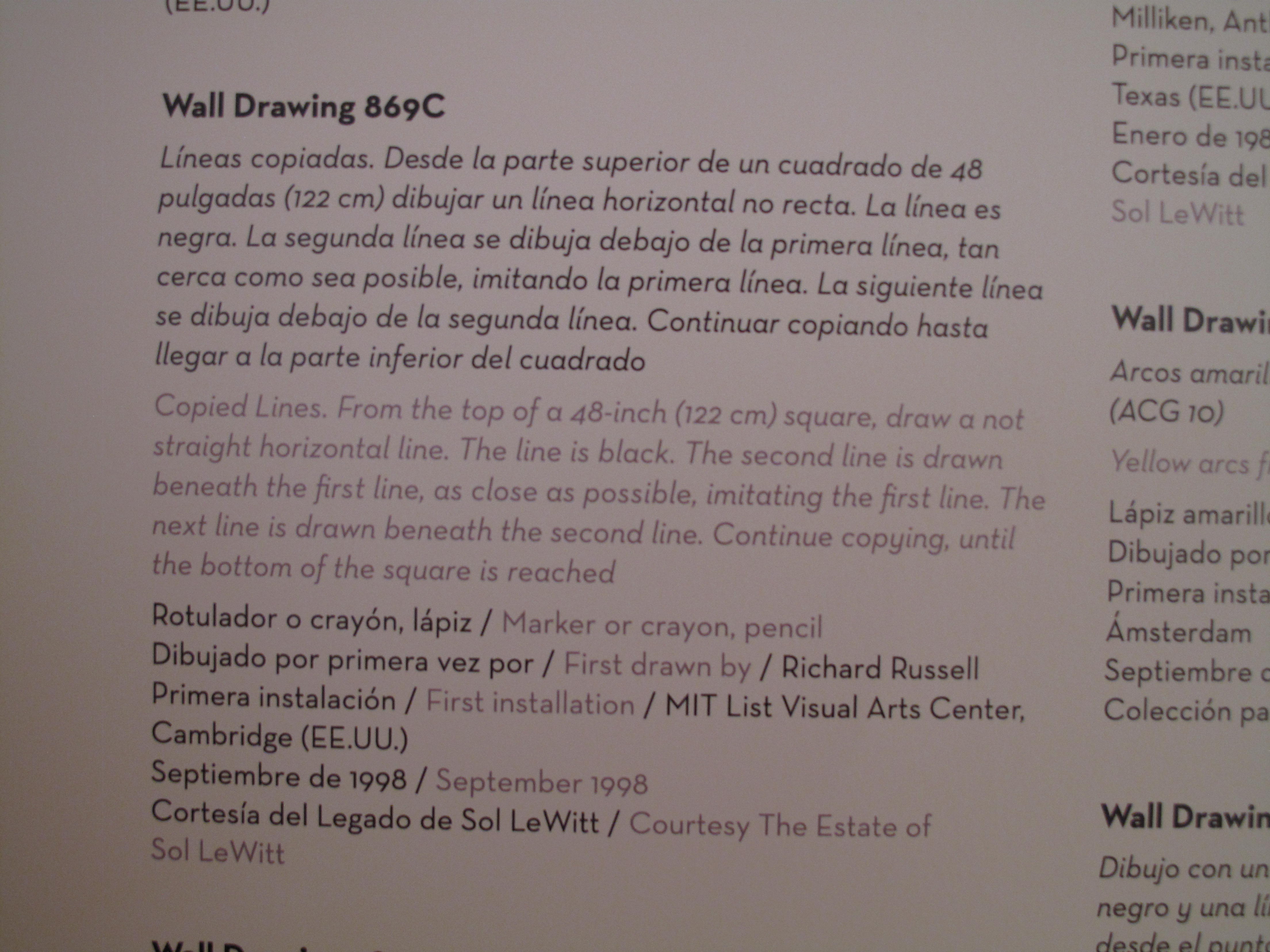 Entender que la idea en la obra de LeWitt, vendría a ser como la partitura del artista -o compositor- y que el mural que nosotros acabamos viendo, el concierto interpretado por unos músicos -o asistentes de artista- bajo la batuta de un director -o comisario- sería una manera de entender esta propuesta de la Botín como un concierto en toda regla revelador del quehacer de un artista para quien la idea estaba siempre por encima de la ejecución de una obra.