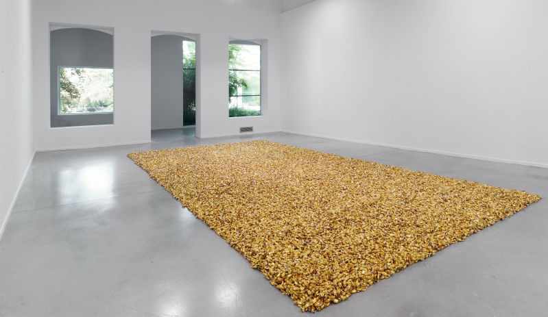 Roni Horn realizó tres Gold fields entre 1980 y 1994. Se trata de una joya de papel arrugado de 122 x 152 cm de oro puro en un 99,999% y 13 kg de peso. Se puede colocar directamente en el suelo sin necesidad de peana. O sea, a pelo, descarnada, sola, silenciosa, desnuda. Como un retrato. Roni Horn conoció el oro en la tienda de empeños de su padre a través de joyas, monedas y la desgracia de la gente que las tuvo que dejar allí. Y esa dignidad perdida es la que llevaría a Roni Horn a querer devolver su esencia al oro asociándolo al sol y dándole, si cabe, todavía más luz.