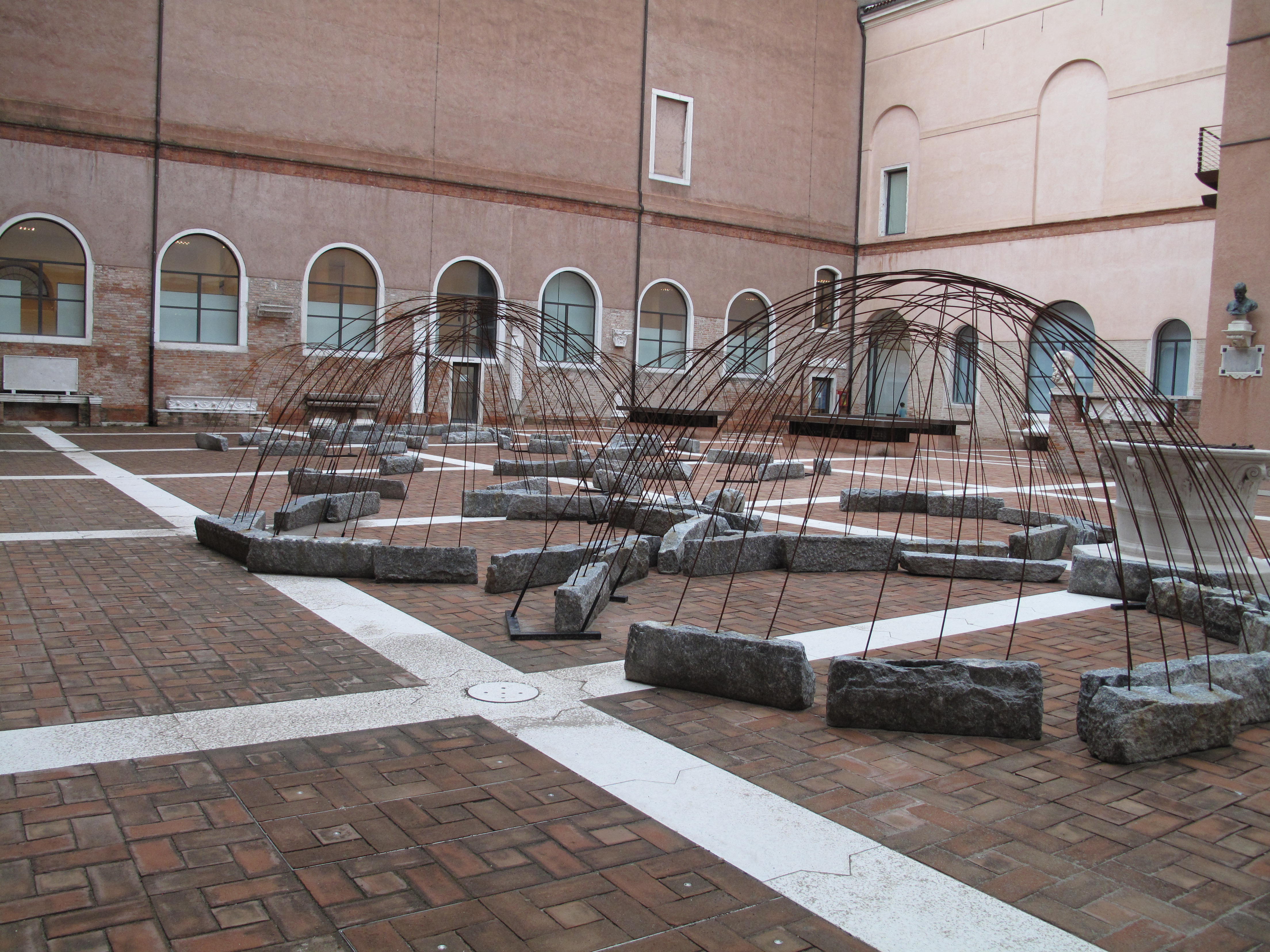 Realizadas entre 1966 y 1992, algunas de las catorce obras de la exposición se podría decir que mantenían una estrecha relación con obras de maestros de la pintura veneciana -como Tiziano, Giorgione o Tintoretto- representados en las salas de la Accademia en una suerte de diálogo ideal, formal y/o teórico hilvanado sobre la base de la concepción de la naturaleza, la luz, el movimiento, el espacio arquitectónico o los lugares del hombre. Si el conjunto de la exposición era una especie de delirio donde el sentimiento de soledad se veía reforzado por la práctica ausencia de público en sus salas, una de las obras que me resultó más estremecedora fue 74 gradini riappaiono in una crescita di geometria concentrica de 1992, una secuencia de iglús formada por bloques de piedra y barras de hierro, ubicada en el patio exterior dell’Accademia invitando a penetrar en el interior de unos espacios abiertos a los cuatro vientos, a la luna, al sol, a la lluvia, a la naturaleza. Un sueño.