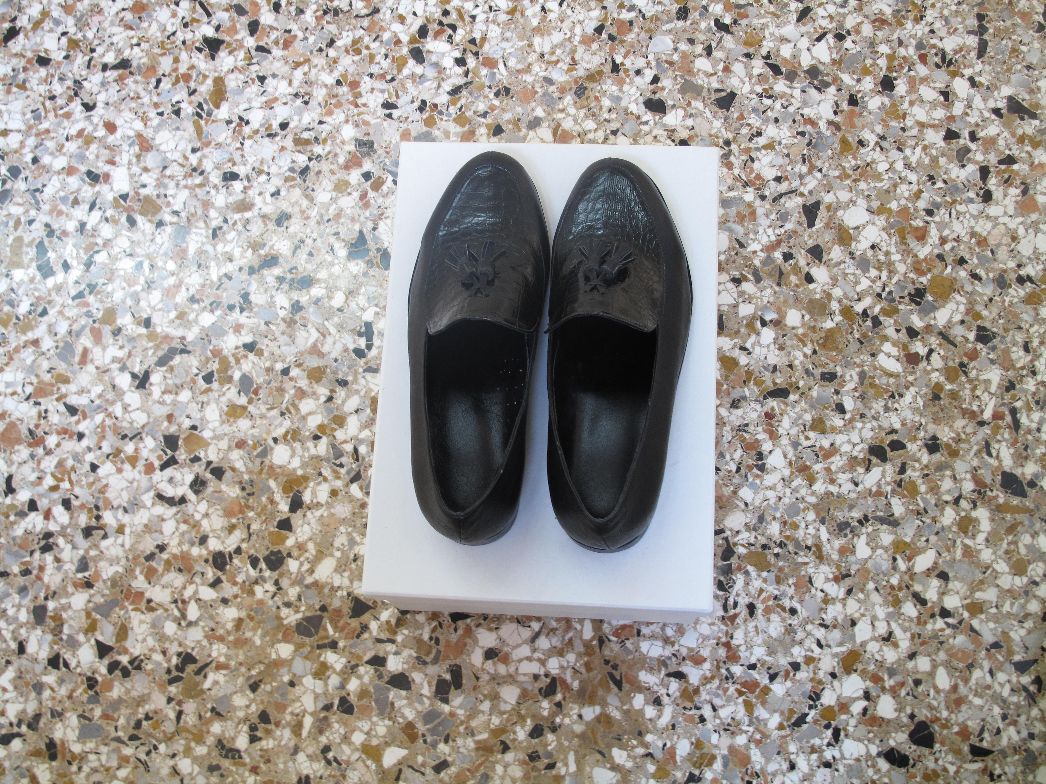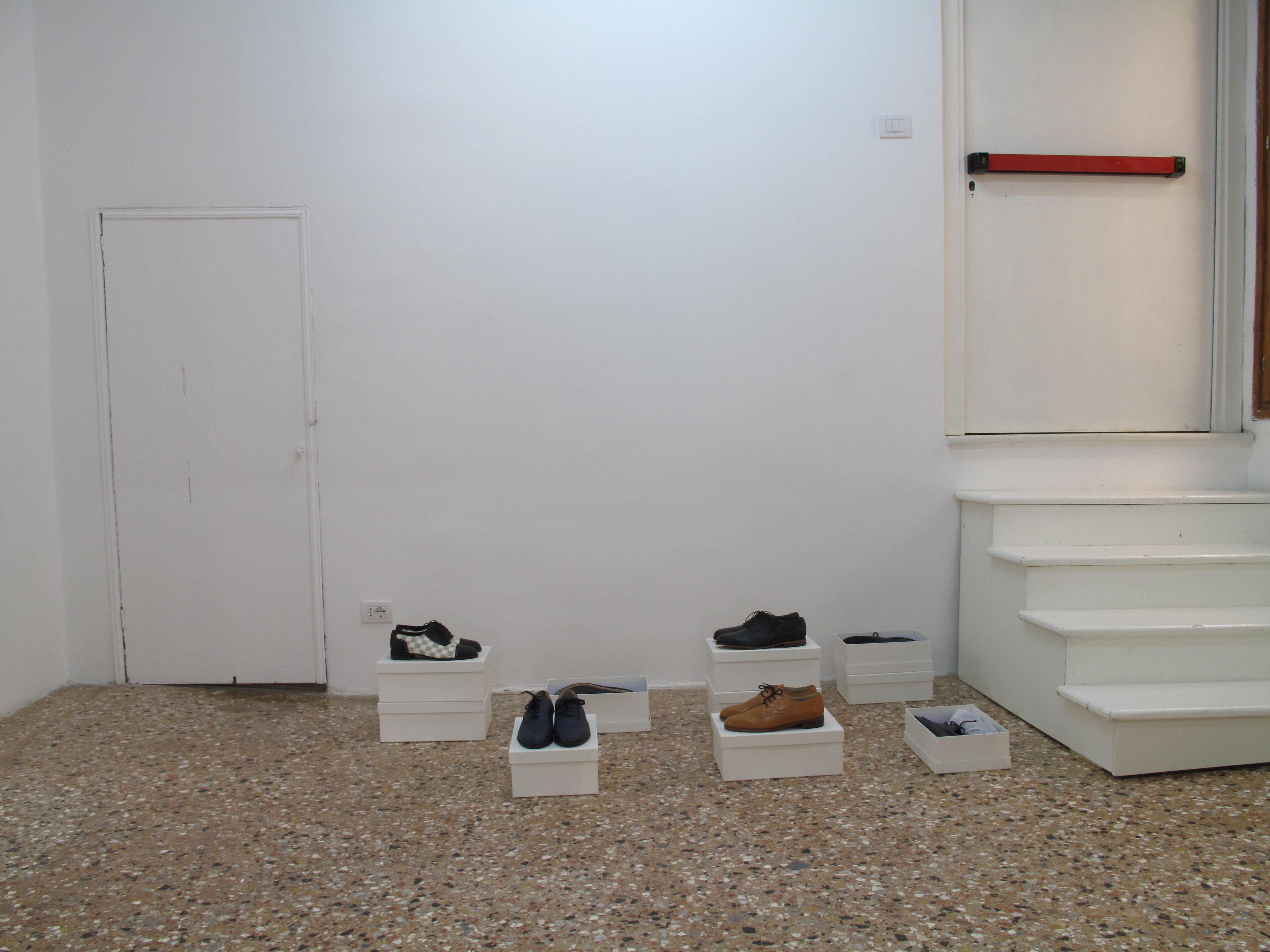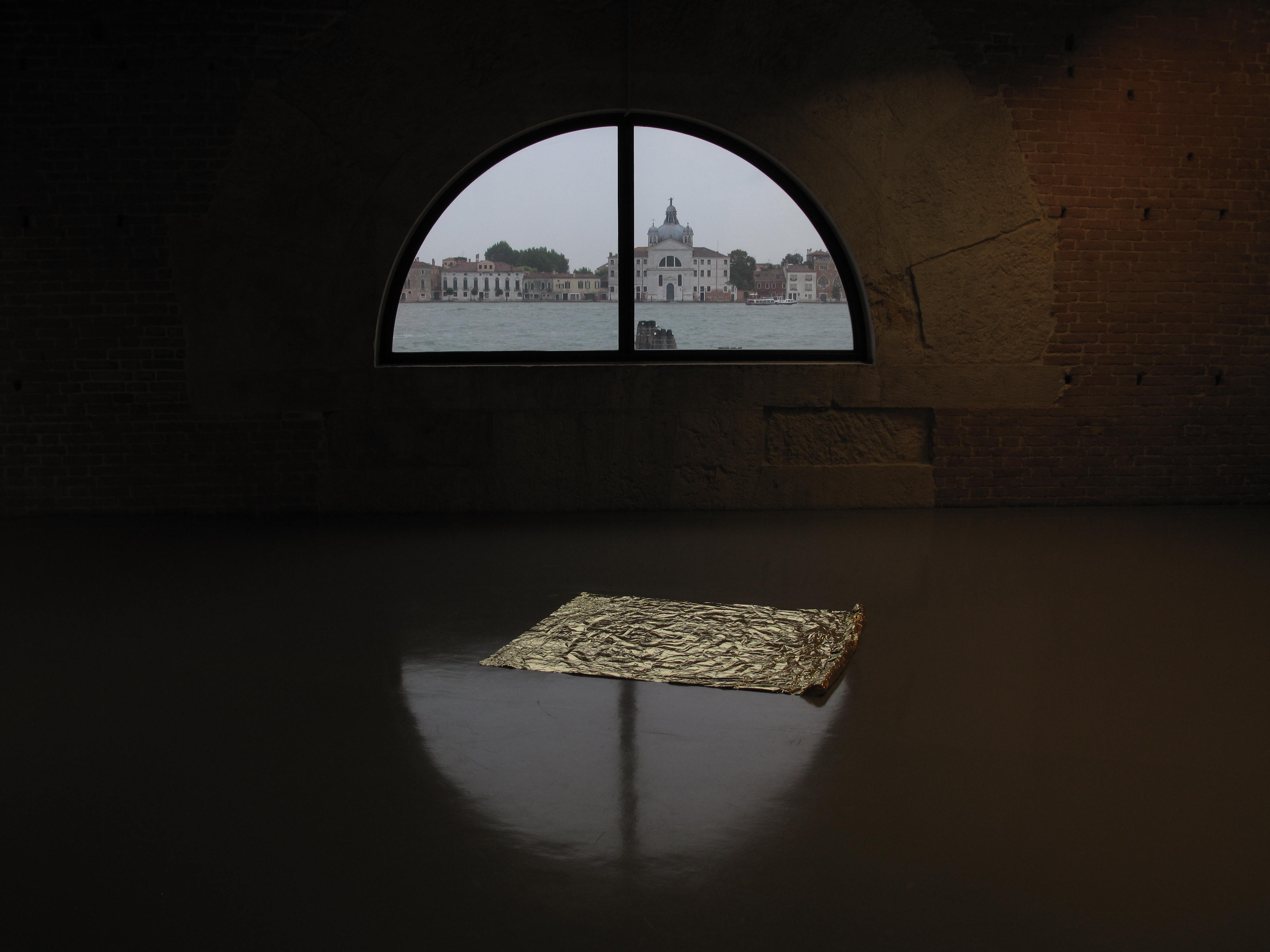 Representado en exclusiva por el artista Christodoulos Panayiotou (Limassol, Chipre, 1978), la suya era una propuesta que, sobre la base de la arquitectura del Palazzo Malipiero, cuestionaba la memoria, la memorialización y la fragmentación histórica en una especie de propuesta abierta destinada a preguntarse acerca de nuestra permanente relación con lo fluctuante que es la acción de escribir la historia. Y esto, que parece tan incomprensible, venía a explicarse de maravilla a través de mosaicos que parecían históricos camuflados por el suelo del edificio, intrigantes cuadros de superficies doradas emulando espejos absorbentes, una fuente, varias obras más y siete pares de zapatos cosidos a mano y realizados con la piel de los bolsos de los manteros de Venecia. Una suerte de jeroglífico visual capaz de cuestionar el ready-made en las prácticas artísticas contemporáneas, nuestra relación con los objetos o la consideración de la arqueología como el instrumento que ha forjado la base de la narración de nuestra historia occidental. Y por si esto fuera poco, estaba bien resuelto desde el punto de vista formal, espacial y evocador.