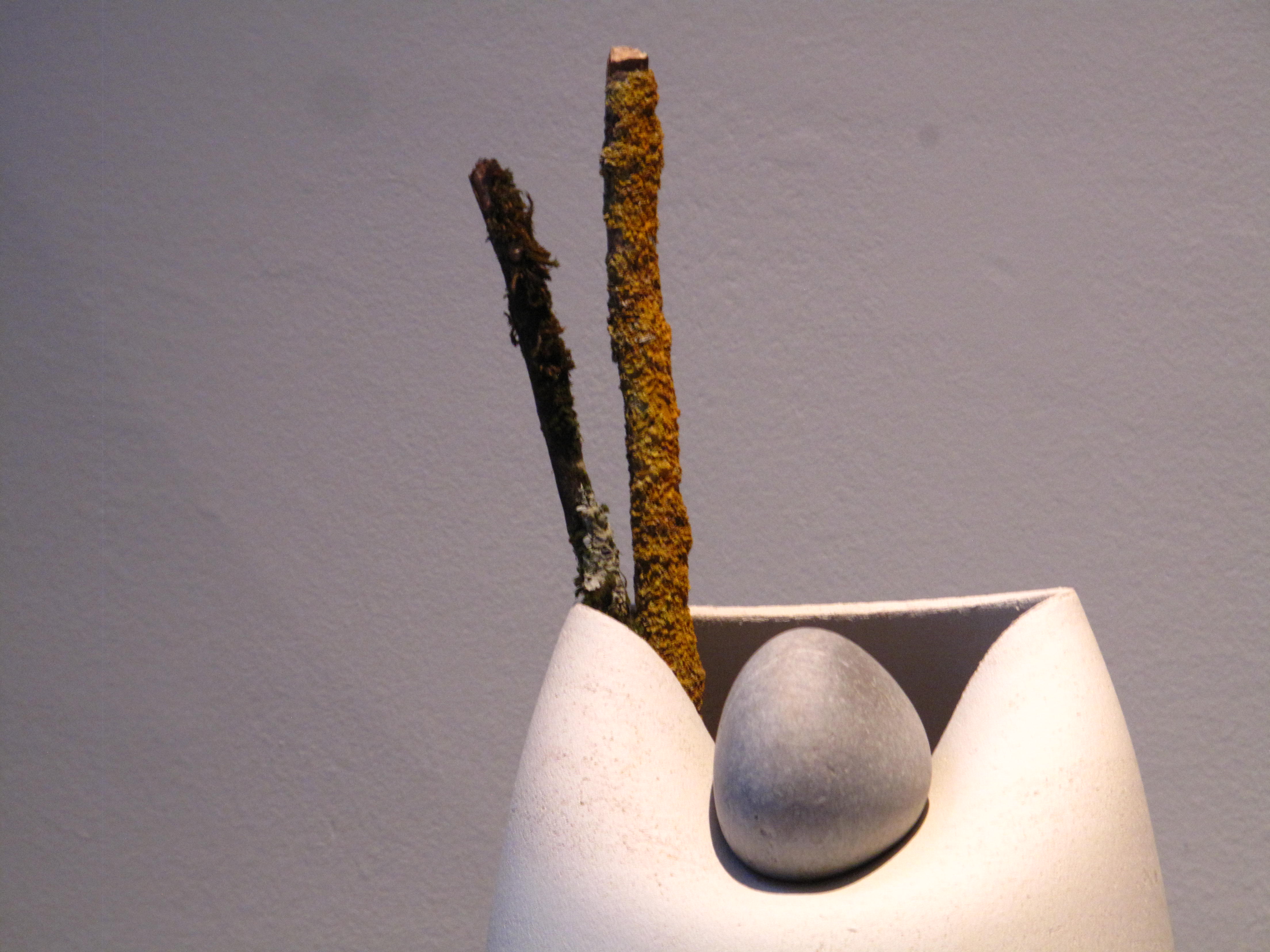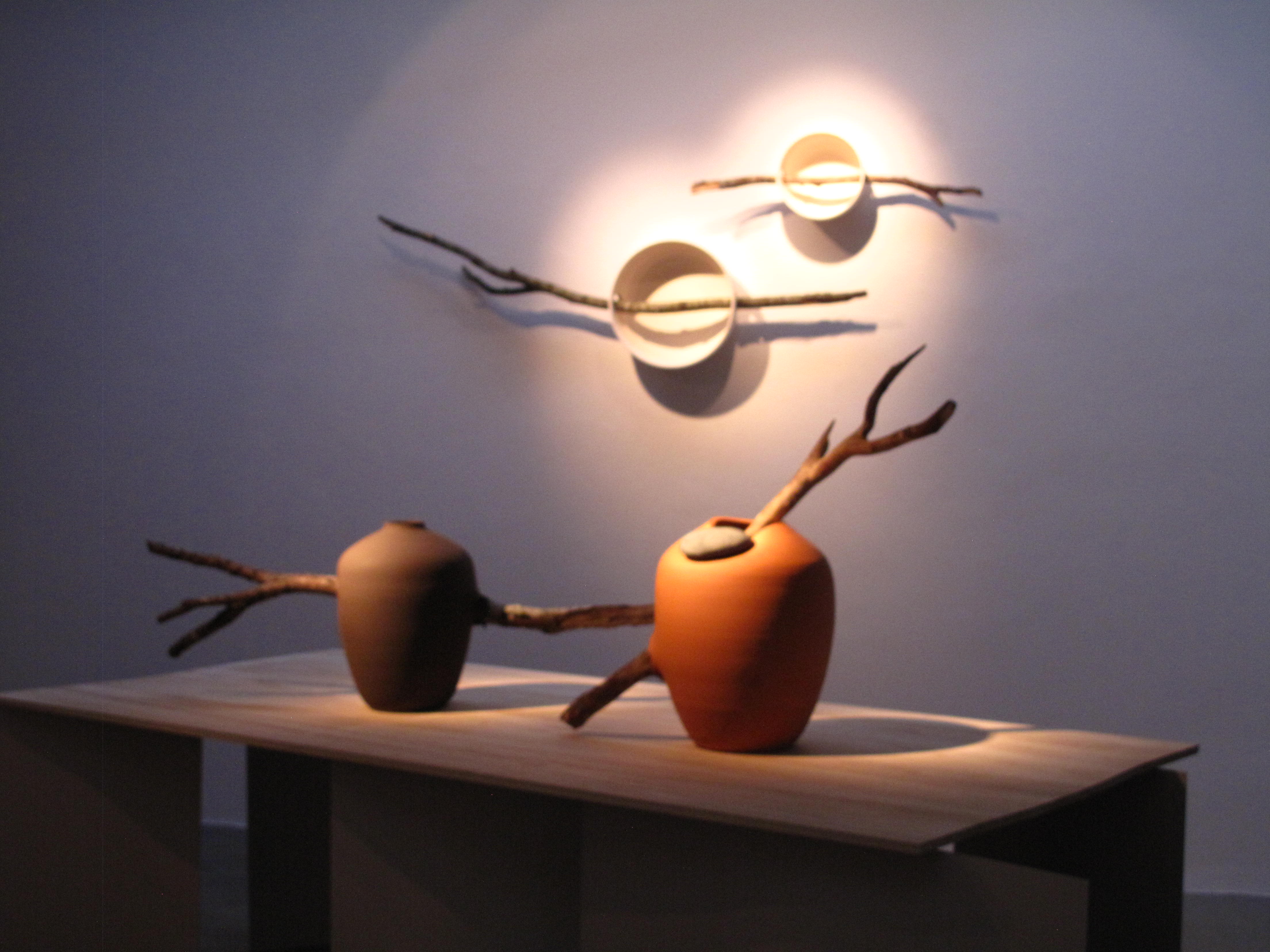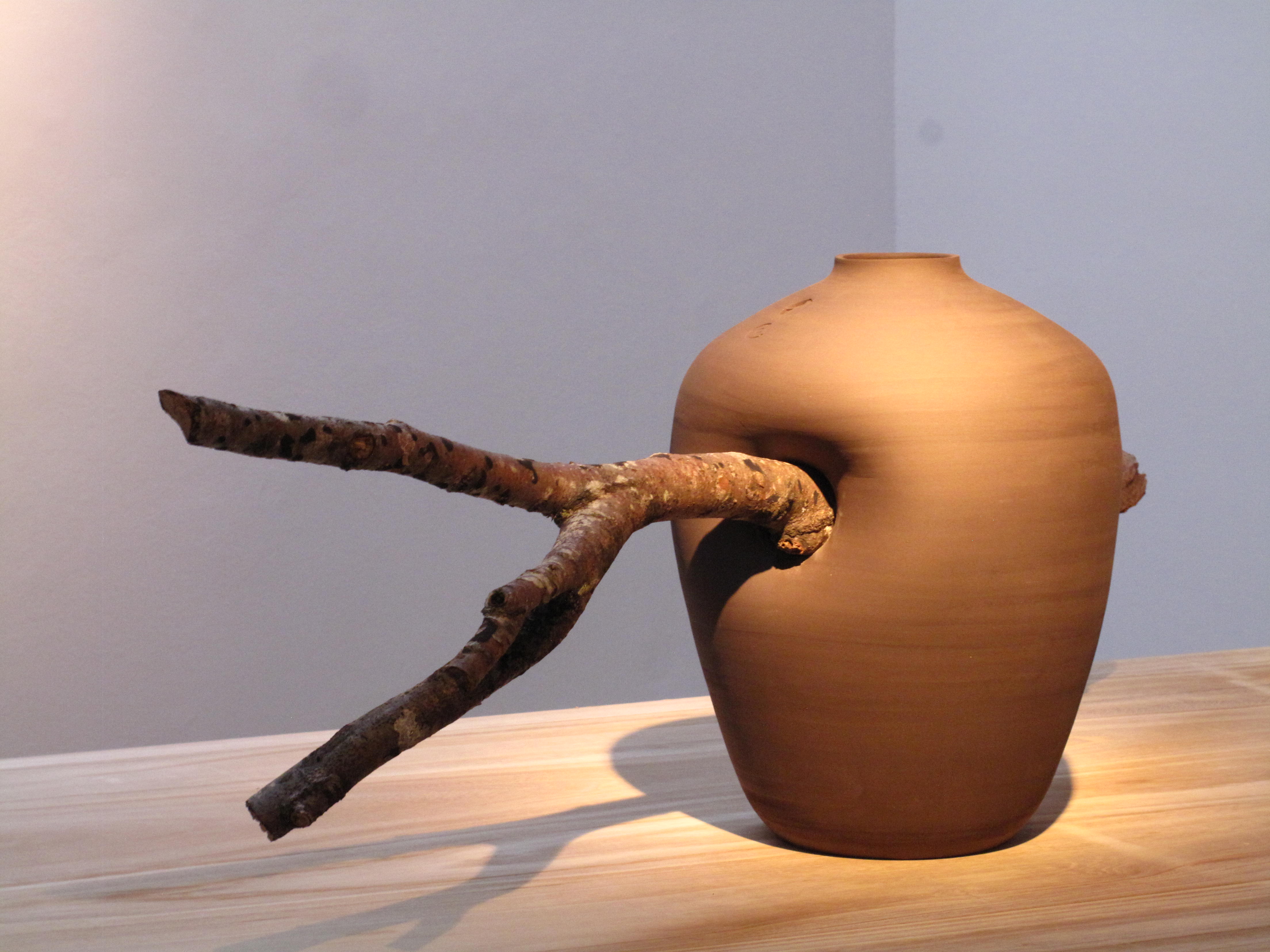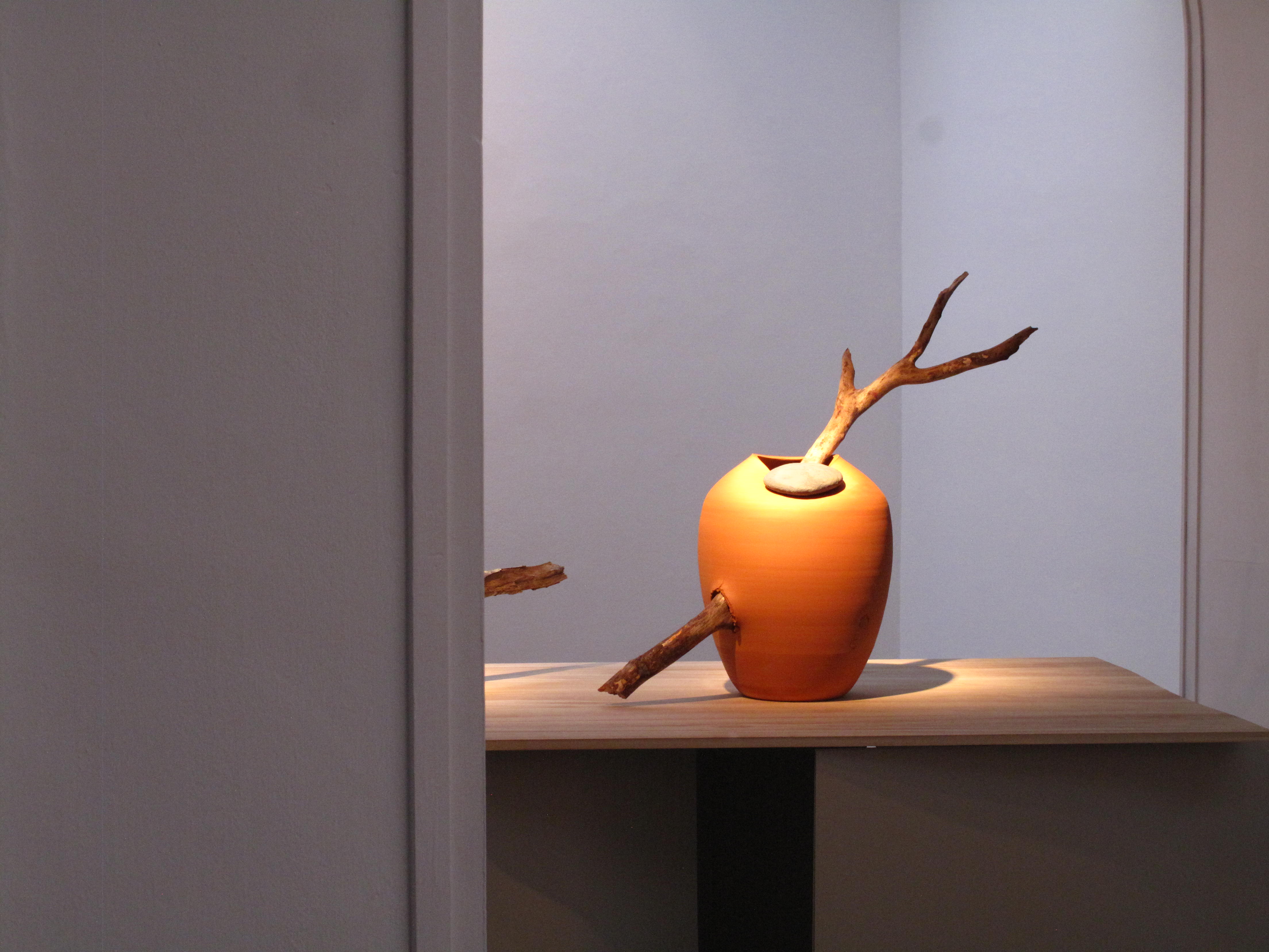 Interesado desde 1999 en explorar la relación entre la cerámica y la naturaleza aunque, más concretamente, entre la cerámica y los procesos y fenómenos naturales como la tierra, el agua y el fuego -recordemos Natural Finish, un proyecto de esta época consistente en abandonar jarrones de cerámica blanca en un rio para recoger las manchas que dejaban el musgo y los líquenes- la exposición que presenta Azúa bajo el título genérico de Manantial es un compendio de algunas de las piezas que viene realizando desde 2011 con el ceramista y alfarero Marc Vidal. Un tándem creativo que, entendido como la colaboración entre un diseñador y un artesano y basado en la idea de que un proyecto debe ser compartido, no tardó en mostrar sus frutos en una serie de decantadores con plantas concebidos para purificar el agua o en otra serie de pequeñas chimeneas concebidas como jarrones de fuego. Dos obras excelsas que no están en la exposición pero que sí son el preámbulo de lo que en ella se puede ver: jarrones y boles dialogando con piedras y troncos así como una serie de contenedores de luz susceptibles de modificar la percepción de un jarrón. Se trata de obras cuya utilidad nos invita a hacernos preguntas del tipo: ¿fueron concebidas para que se posaran los pájaros?, ¿fueron ideadas para que se adaptaran las piedras?, ¿fueron inventadas para que temblara la luz? o ¿fueron creadas para despertar nuestros sentidos?, etc.