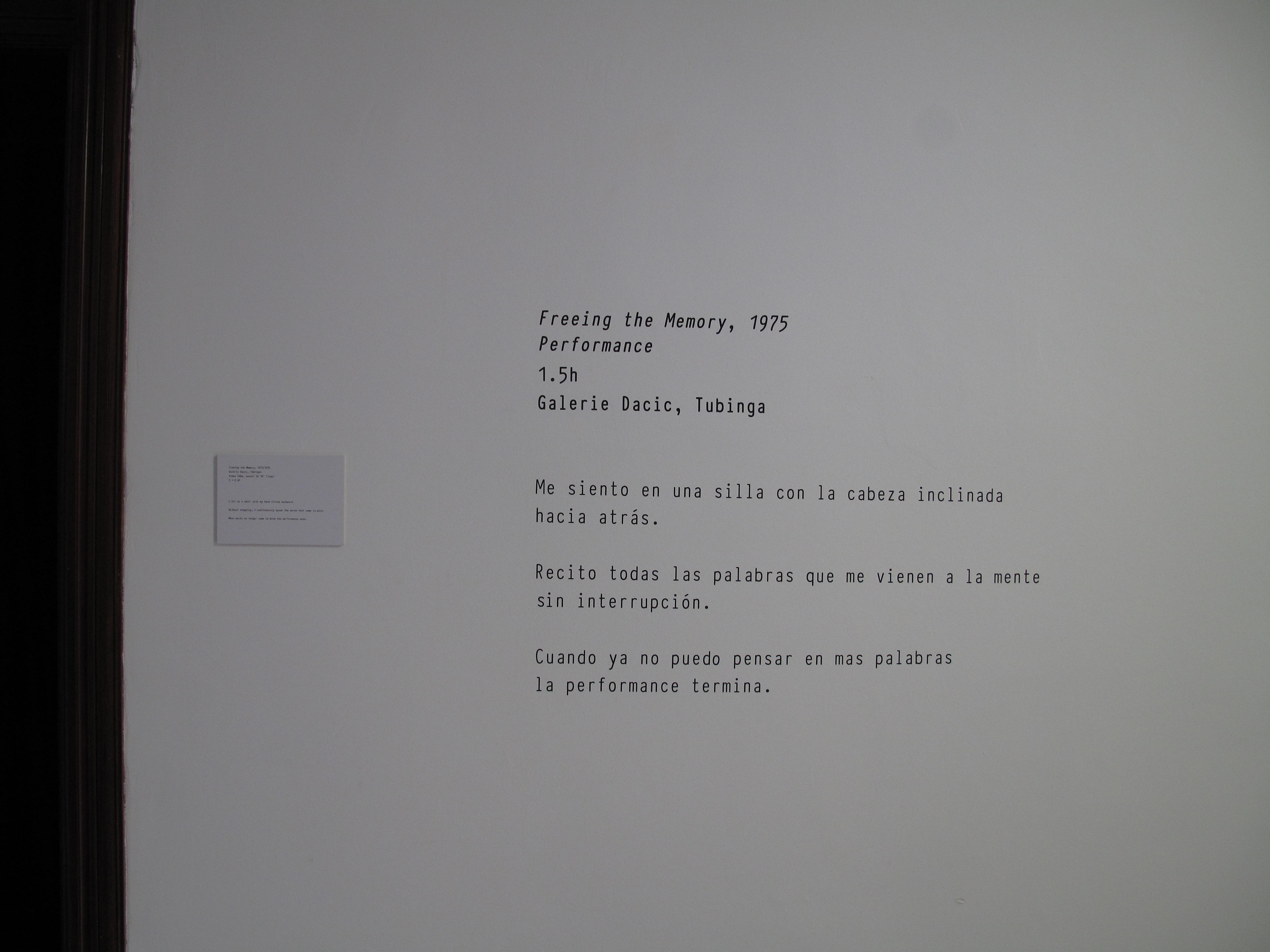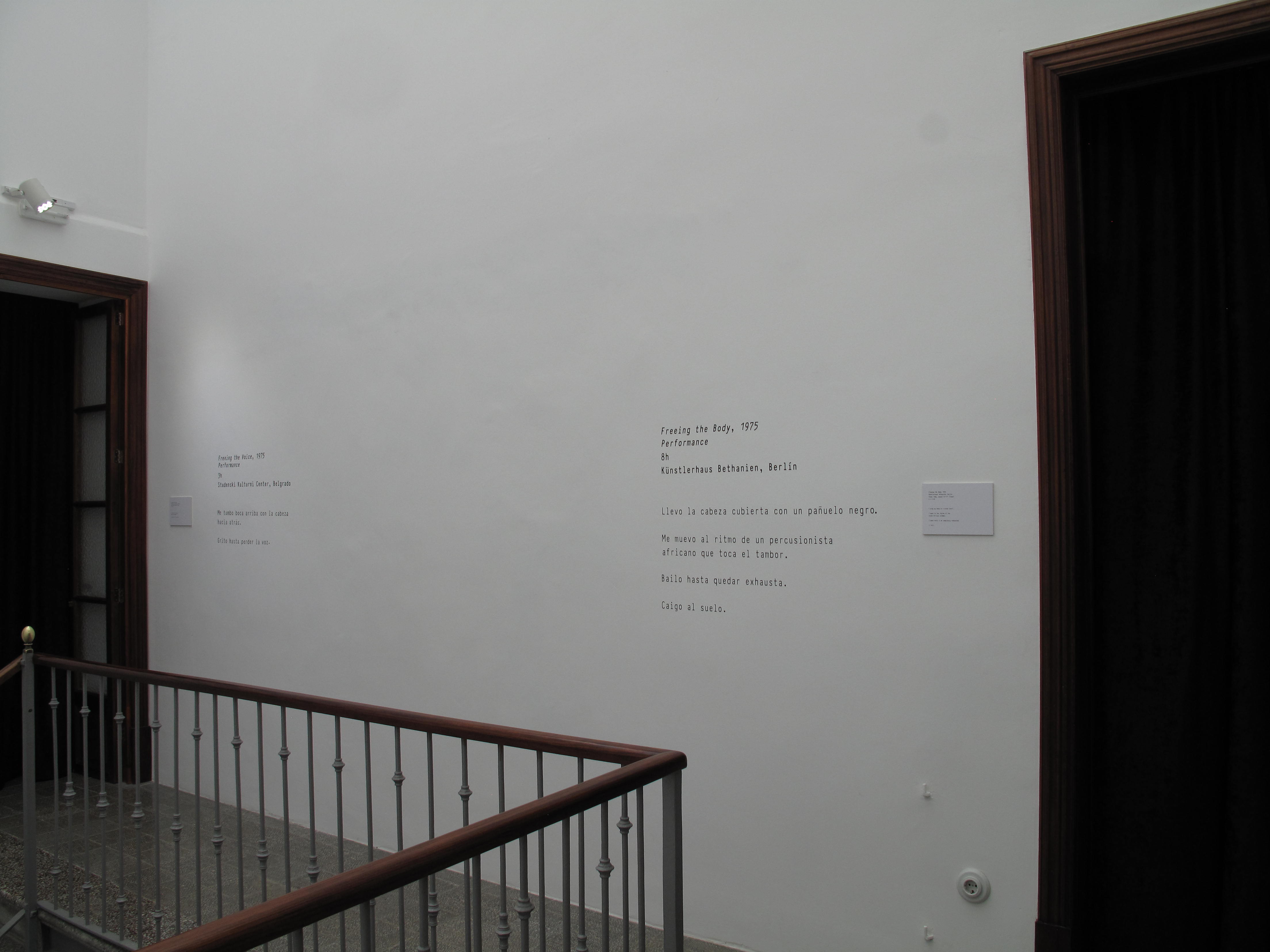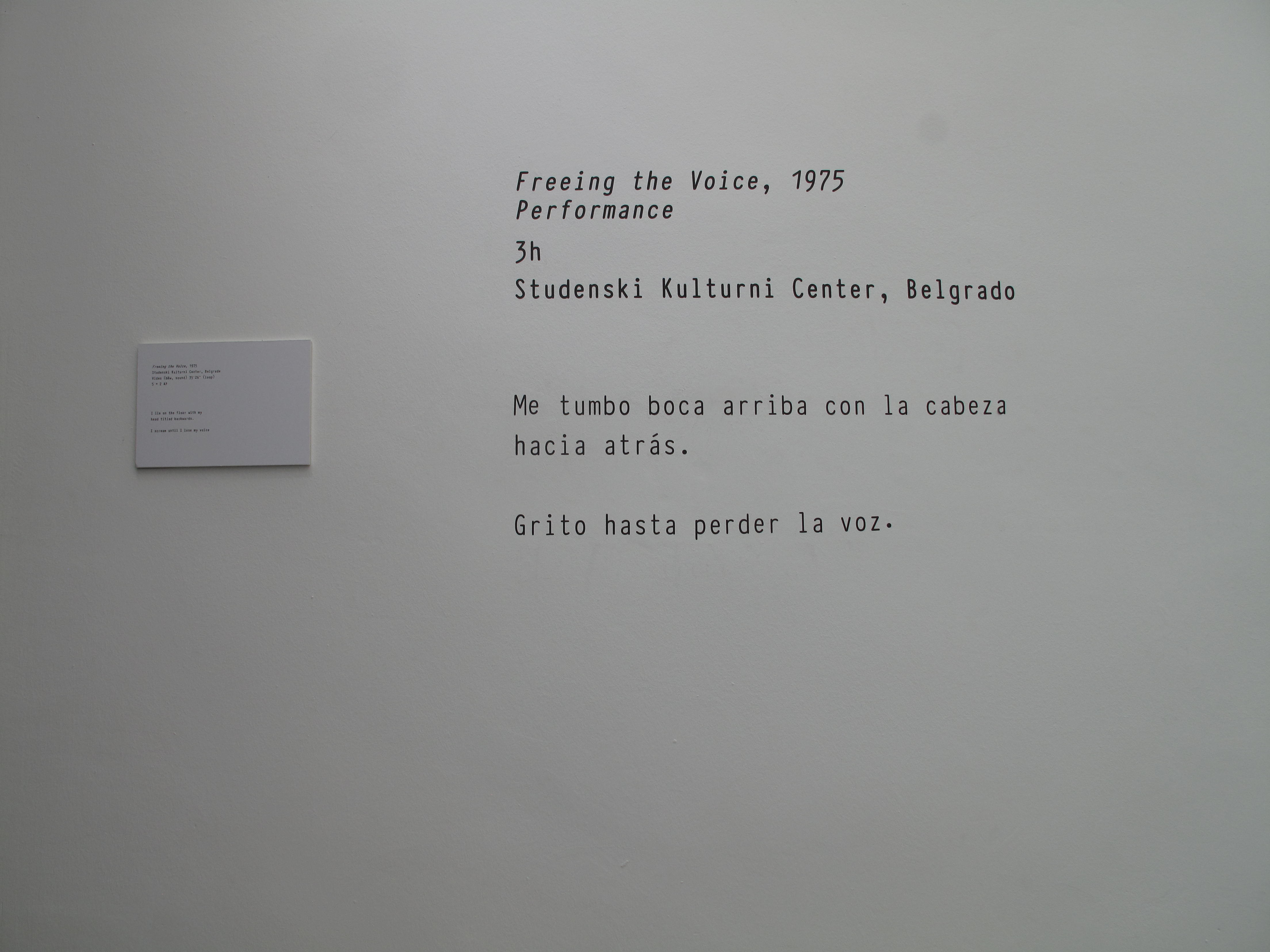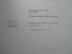 Sólo -literalmente- ante el peligro de aquellas tres grabaciones en las que la artista pone a prueba su cuerpo –Freeing the body– su voz –Freeing the voice– y su memoria –Freeing the memory– me vi sumido en una suerte de comunión con una artista que, al margen de todo prejuicio, me estaba diciendo que lo que hacía era de verdad y que si yo estaba allí era porque me daba la gana y porqué quería ver hasta qué punto su memoria se desmoronaba, su cuerpo sucumbía, su voz se callaba o si yo me daba por vencido a la que pasaran unos minutos. Una especie de lucha entre ella y yo -no había nadie más en la sala- para ver quién era el más fuerte: o ella soportando la tortura a la que se sometía en tres versiones o yo soportando el declive hasta la extenuación de un cuerpo que, aunque fuera a través de un video, me estaba hablando de nuestra fragilidad, de la limitación de nuestra mente o, en general, de lo acotada que es nuestra vida entre el nacimiento y la muerte.