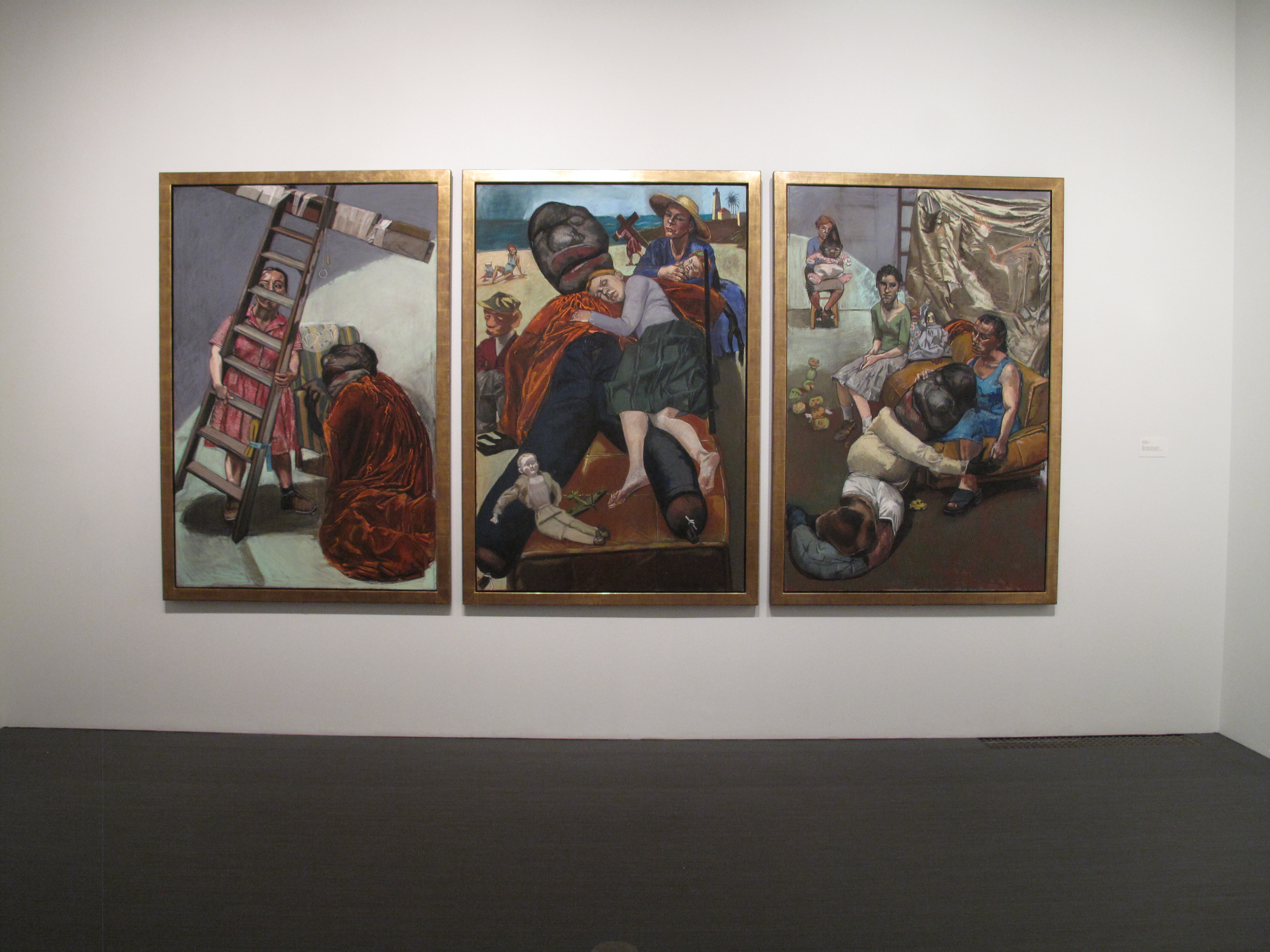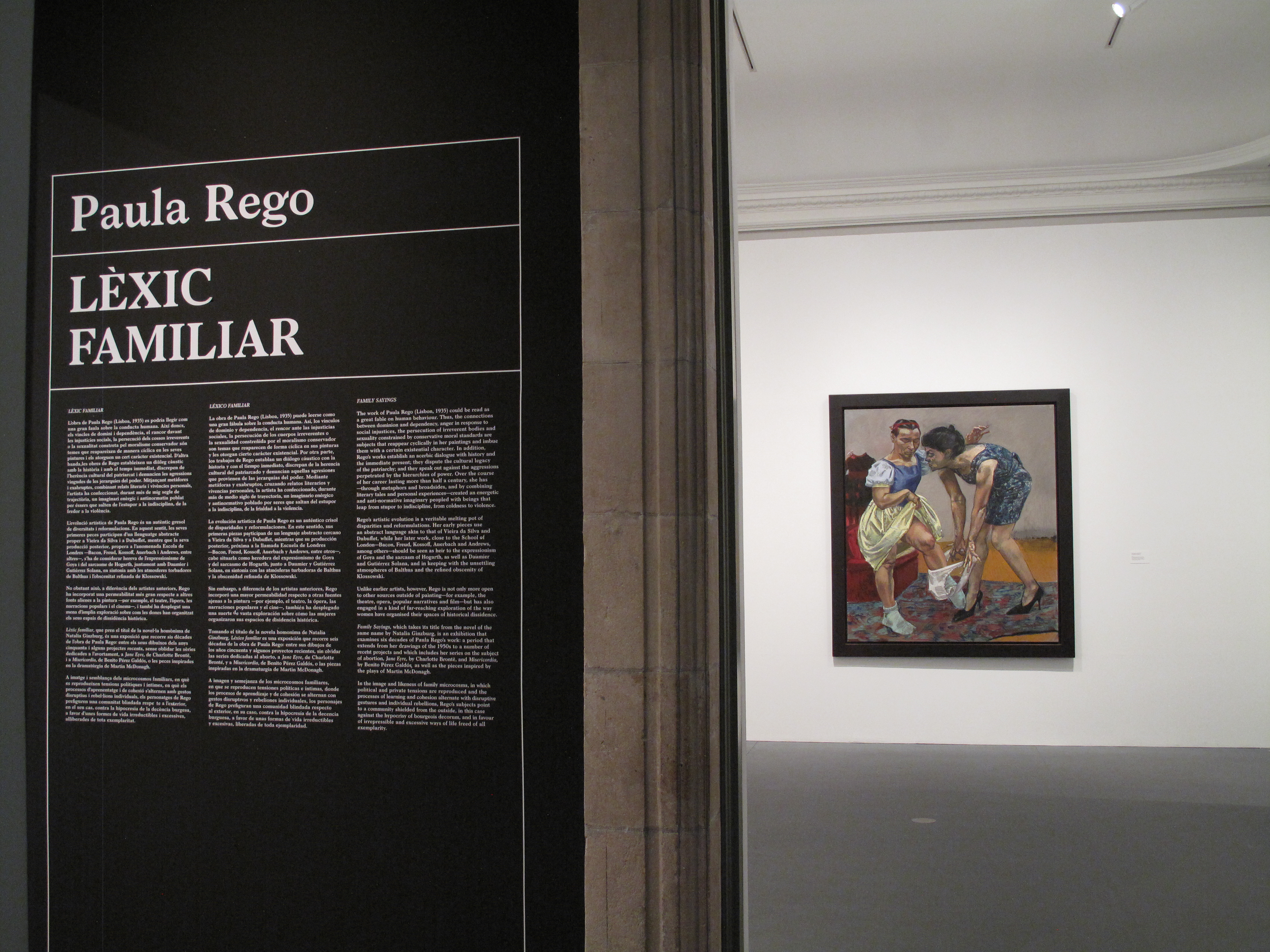 Ocupando la práctica totalidad de las salas de exposición de la primera planta del Palau de la Virreina -16 de las 18 que tiene- la exposición de Paula Rego reúne un elenco de obras que, bajo el título de Léxico familiar -tomado, como se dice en la guía de mano, del libro homónimo de Natalia Ginzburg– se me antojó como una galería de retratos de los seres que dan vida al alma de esta inmensa artista. Porque lo que se puede ver tras la sabia combinación de las obras que se han seleccionado para esta exposición -entre ellas: óleos sobre lienzo, dibujos, acuarelas, grabados y una suerte de instalación protagonizada por un armario que pone los pelos de punta- son personajes que, como dice esta misma guía que nadie-sabe-quien-ha-escrito, «prefiguran una comunidad blindada respecto al exterior, en su caso, contra la hipocresía de la decencia burguesa, a favor de unas formas de vida irreductibles y excesivas, liberadas de toda ejemplaridad».