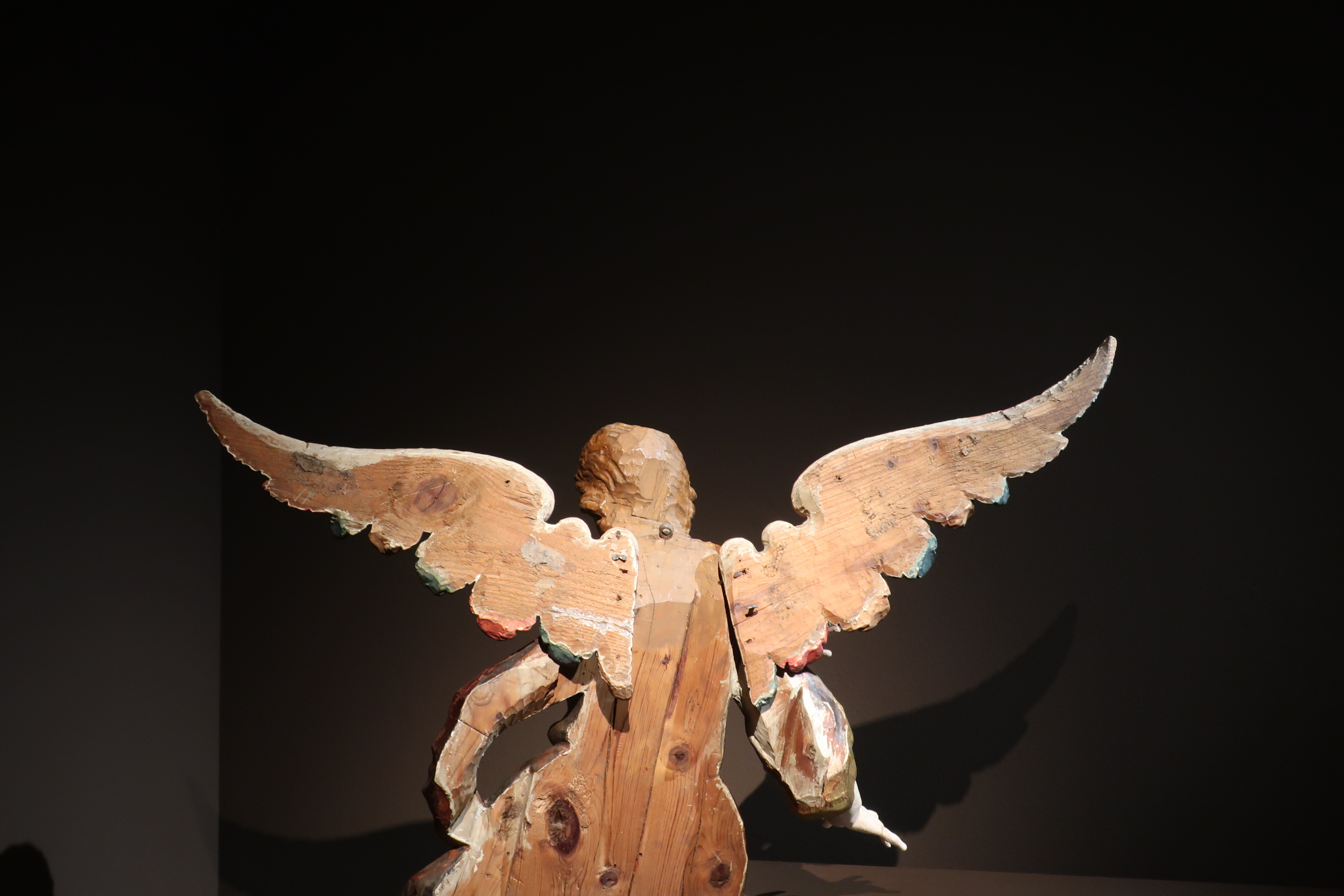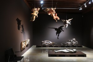Tras pasar los relicarios y la sala del contrapunto, ocupada por ángeles descendiendo del techo y proyectando sus sombras sobre la pared, se llega al espacio de los reversos, uno de los espacios que me llegó al alma con más rapidez. Presidido por un ángel de cara a la pared de modo que en lugar de mostrar sus plumas muestra la rugosidad de la madera con que su verso había sido tallado, el espacio de los reversos es donde se muestra lo que nunca vemos porque siempre hay algo que lo impide. Como por ejemplo, una pared, un órgano, un retablo, etc. Se trata de permitir el acceso a lo que desconocemos pero, sobre todo, de entender que lo que vemos es una construcción y, como tal, el espacio donde es posible la imperfección, donde no es necesario que termine nada. El límite entre lo que vemos y lo que es, entre la realidad y la ficción.