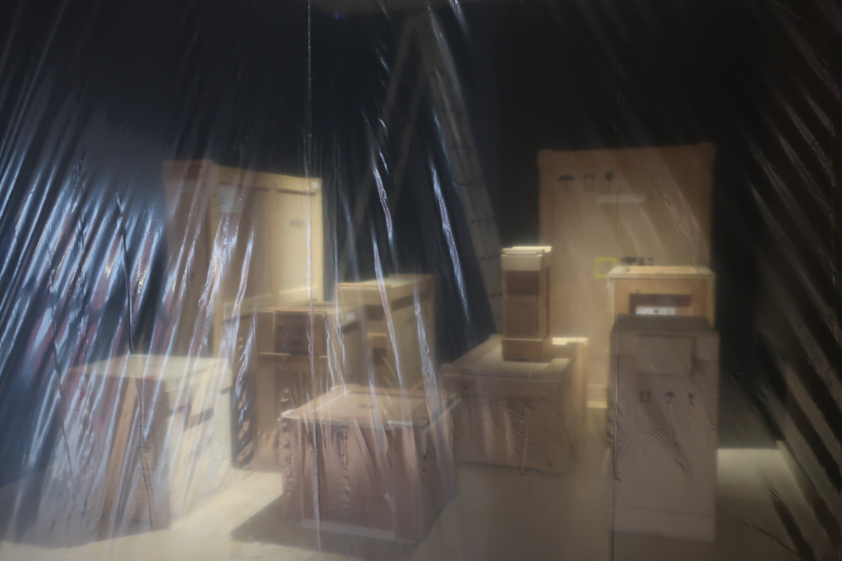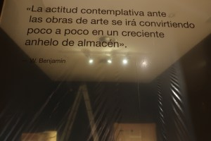 A modo de epílogo y antes de abandonar la exposición, se pasa frente a una sala sellada por un plástico en cuyo interior se puede percibir una suerte de bodegón formado por cajas de embalaje tan propias y características de un almacén de museo. Impreso en la parte superior izquierda y como despedida del paisaje que hemos transitado, el público es conminado a leer la siguiente cita de Walter Benjamin: «La actitud contemplativa ante las obras de arte se irá convirtiendo poco a poco en un creciente anhelo de almacén».