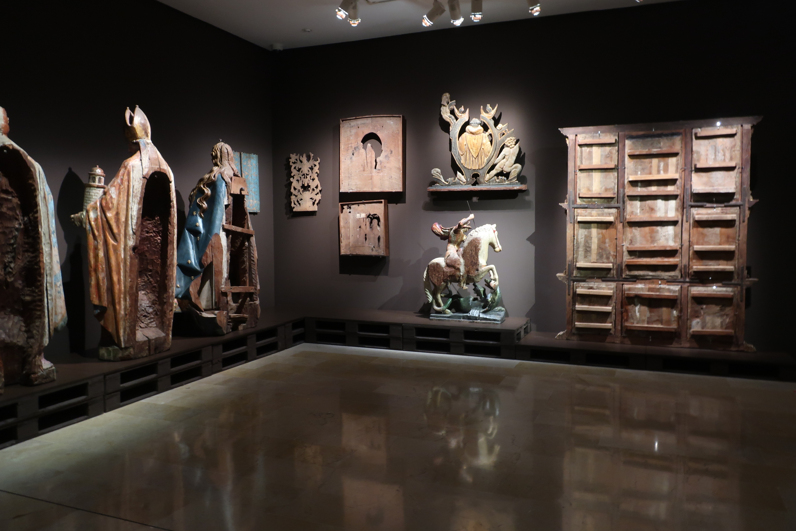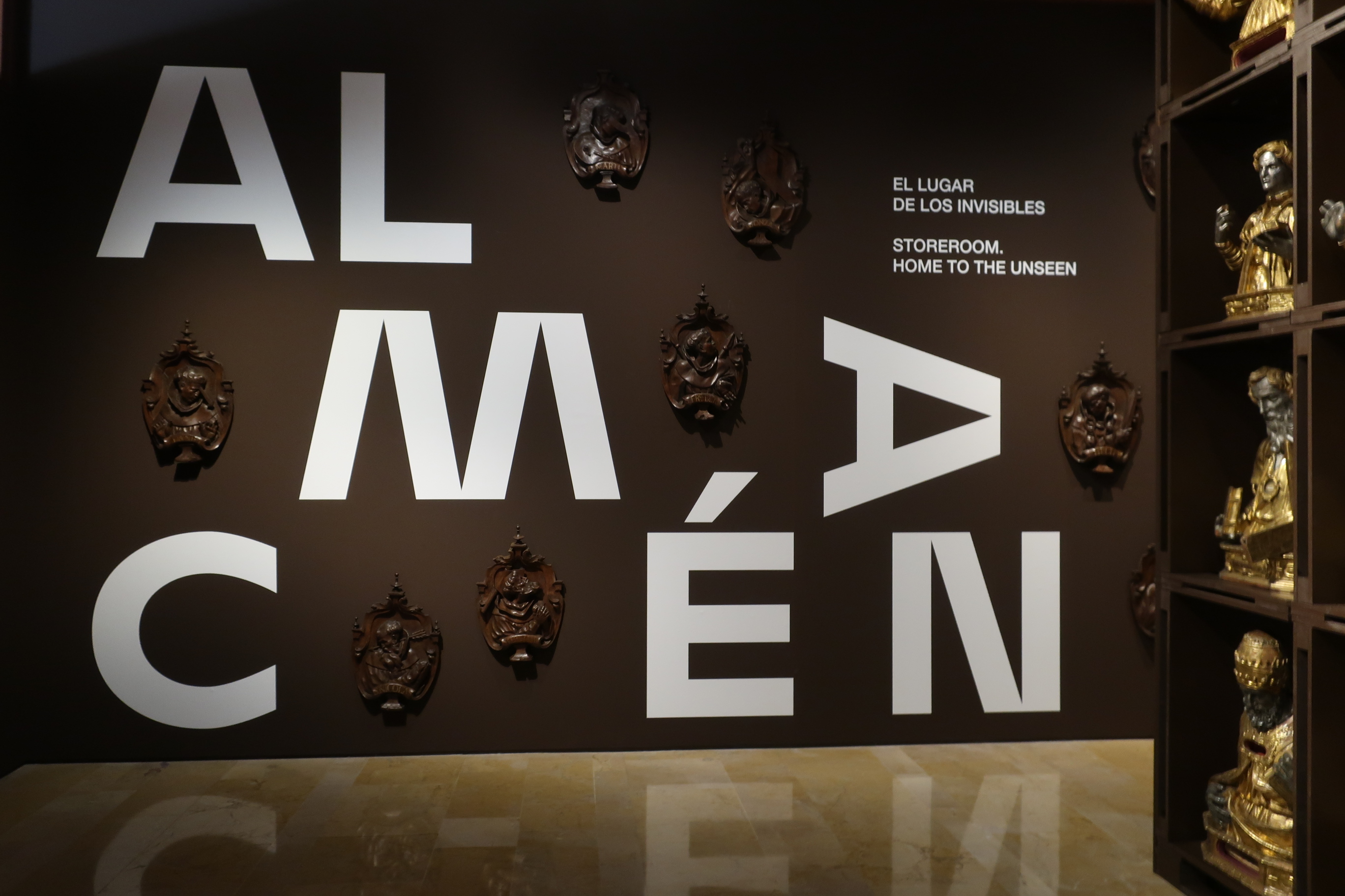 Lo que aguarda al visitante tras cruzar el umbral de la puerta de entrada es el espacio de la repetición, una enorme estantería de madera habitada por veintitrés bustos relicario procedentes de los conventos de San Diego y de San Pablo de Valladolid, de factura napolitana y realizados en torno al año 1600. Junto a ellos y en el espacio reservado al título de la exposición, se muestran, en la pared, diez remates de sillería de 1735 procedentes del convento de San Francisco de Valladolid iluminados, como toda la exposición, con una tenue luz capaz de cautivar al espectador en la medida en que apela a los sentimientos al margen de lo que contempla con sus ojos. Se trata de un comité de recepción que, poniéndonos sobre la pista de lo que, a partir de entonces, se verá en las siguientes salas, habla de aquellos modos de mostrar el arte pensados para compartir con el espectador la vida de aquellas obras, fragmentos, piezas y elementos que, sin solución de continuidad, habitan, respiran y existen en los almacenes de un museo. En el lugar de los invisibles.