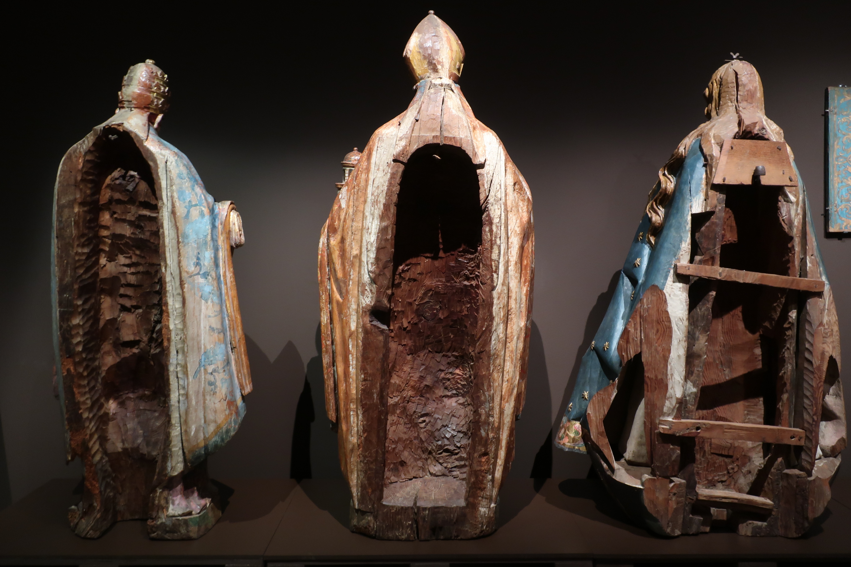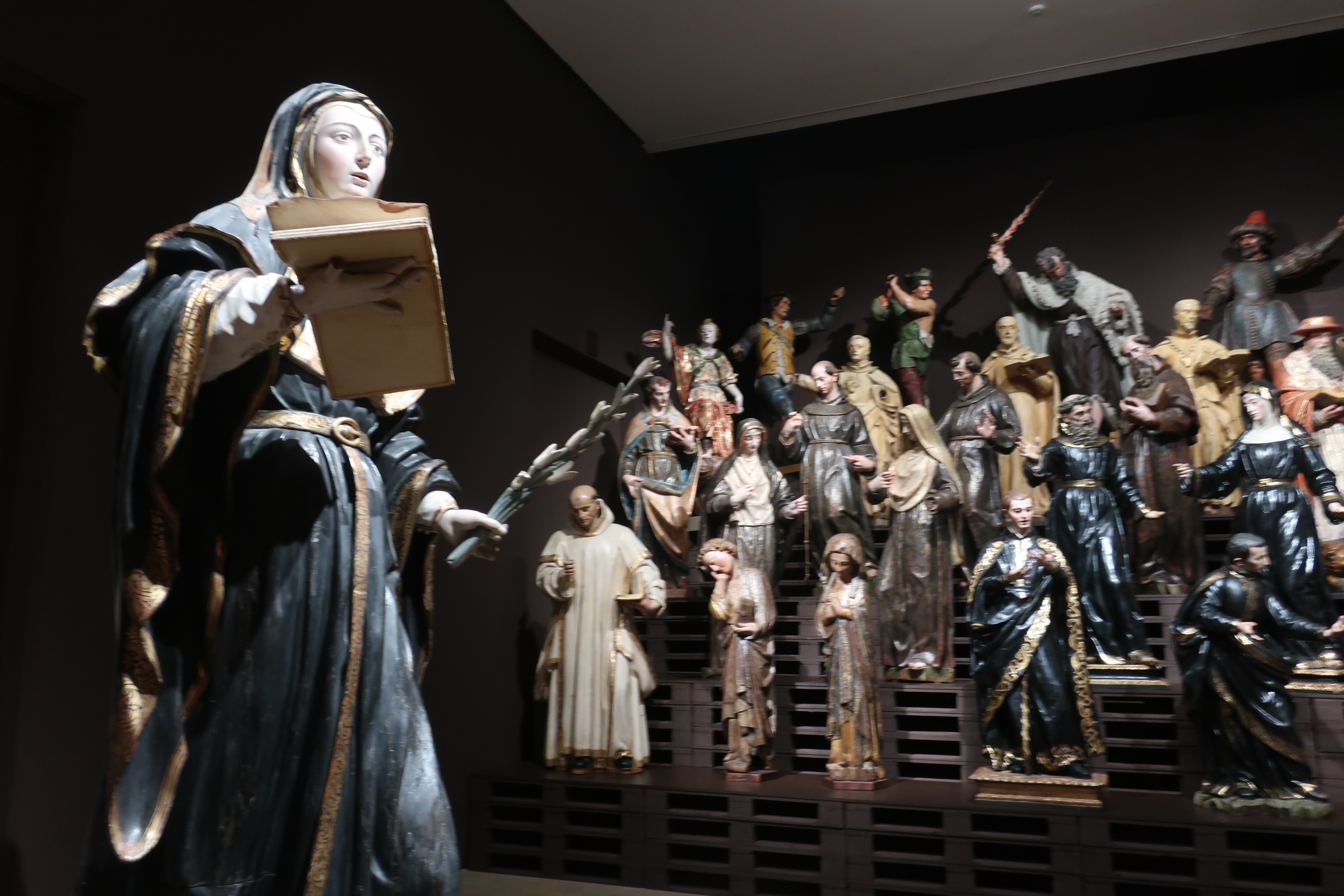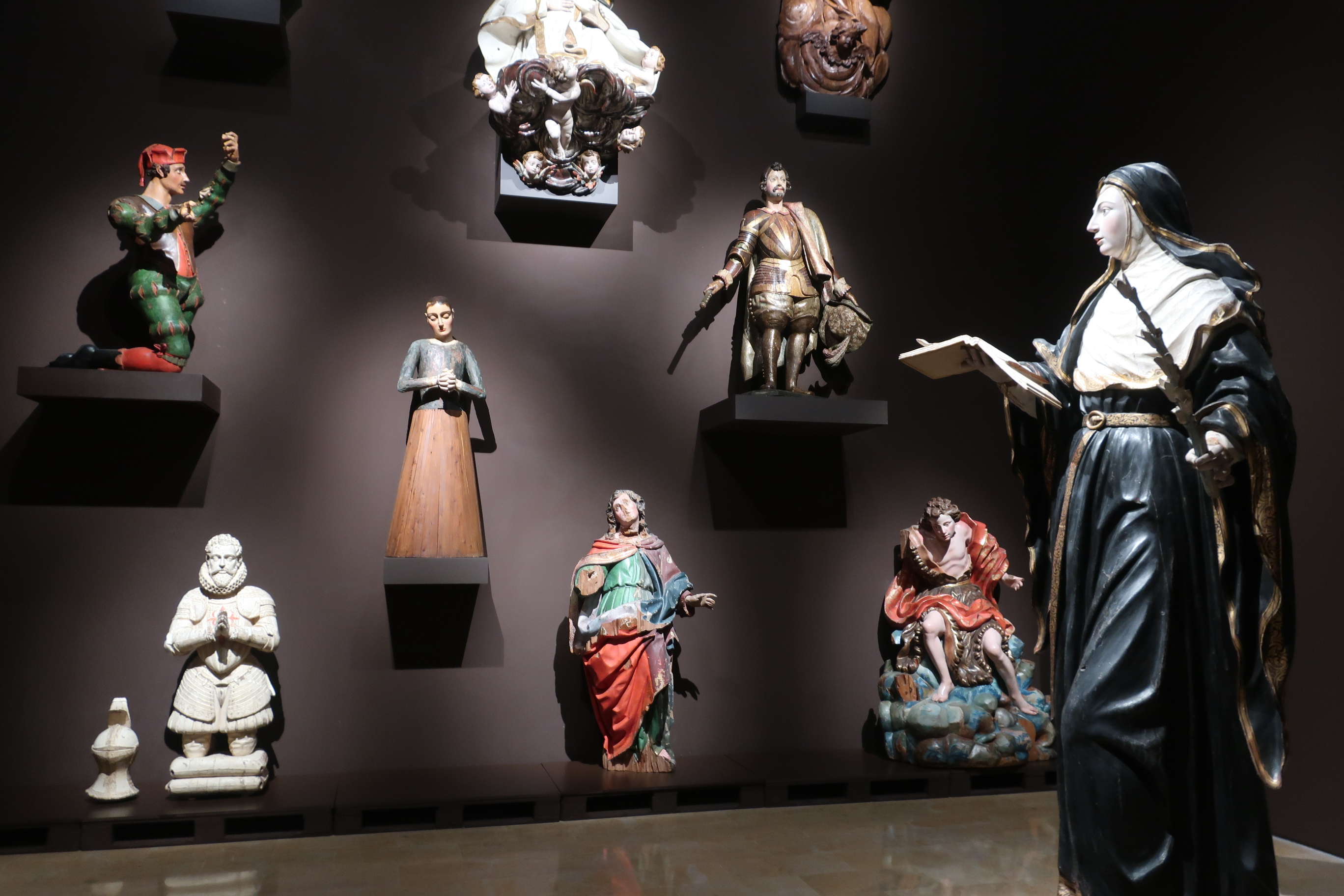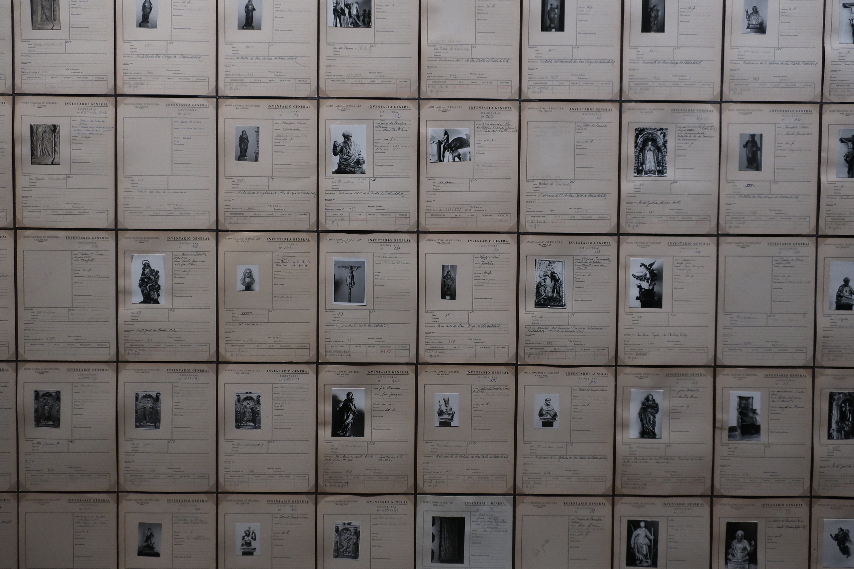 Enfrascado en el debate interior en torno a la importancia de quién soporta y es soportado -o en el de quien manda y quien obedece- se llega a la sala de los solistas y la coral, otra de las salas en las que pueden dejar sin respiración. Configurada, a la derecha, por un graderío de madera ocupado, en su práctica totalidad, por veintiocho figuras de santos y vírgenes formando un coro tipo Góspel (por el movimiento de sus integrantes, quiero decir) y frente a ellos, a la izquierda del visitante, por diez figuras de otros santos, caballeros y vírgenes montadas individualmente sobre repisas capaces de soportar el peso de cada talla (me dijeron que alguna de ellas puede alcanzar los 100kg), la sala donde se agrupan cincuenta figuras que, más que imágenes religiosas, se me antoja como una reunión de amigos con muchas ganas de pasárselo bien, sorprende por la frescura en el tratamiento de lo sacro así como por el acceso a la expresividad de unos rostros liberados del yugo eclesiástico y cercanos a un modo de sentir más humano y ajeno por completo a la fe y la devoción. O sea, pura vida. Para reforzar esta reunión fraternal y mostrar el mismo coro en base a una sintaxis distinta y más cercana a la que es propia del archivo de un museo, lo que encuentra el espectador al traspasar la sala de estos cantores es una pared forrada con ciento sesenta y cinco fichas de inventario datadas en el s. XX. Es decir, el registro gráfico de las entrañas de un museo que hace las delicias de los amantes del archivo, la clasificación, el orden y la organización de la vida, en general.