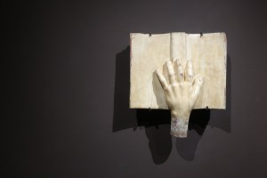 La sala que sucede a esta pared empapelada de archivo, es la que se dedica al libreto, una sala en la que un libro aparece entre las manos de todas las figuras que la componen. Si en la estancia de los solistas y el coro era la música, el góspel y el júbilo hacia lo que nos dirigía el movimiento de sus figuras, en la sala del libreto es el espíritu de una biblioteca el que invita a la reflexión. Se trata de una sala para la lectura, una sala de silencio, una pequeña sala para pensar. Formada por una pléyade de profetas, vírgenes y santos de tamaño reducido y reposando, como en la sala del coro, sobre un pedestal de madera parecido a un archivador de dibujos y grabados, hay en esta estancia una pieza muy especial que destaca por su rotundidad, simplicidad, extrañeza y apabullante contemporaneidad: una mano con un libro de Santo clérigo menor, realizada en el s. XVIII y procedente del Convento de la Encarnación de Valladolid. Se trata de una suerte de fragmento corporal que anuncia, veladamente, lo que vendrá en la sala siguiente: una invitación a leer el fragmento como parte de un todo y no como una muestra de lo desechable.